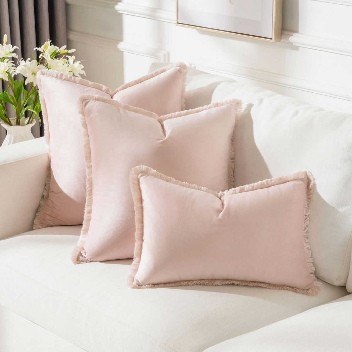 Q: What styles do these pink velvet pillow covers complement?A: The FUTEI Pink Velvet Decorative Throw Pillow Covers add a stylish touch to various decor styles, including boho, modern, and European aesthetics, making them versatile for use in living rooms, bedrooms, and more.