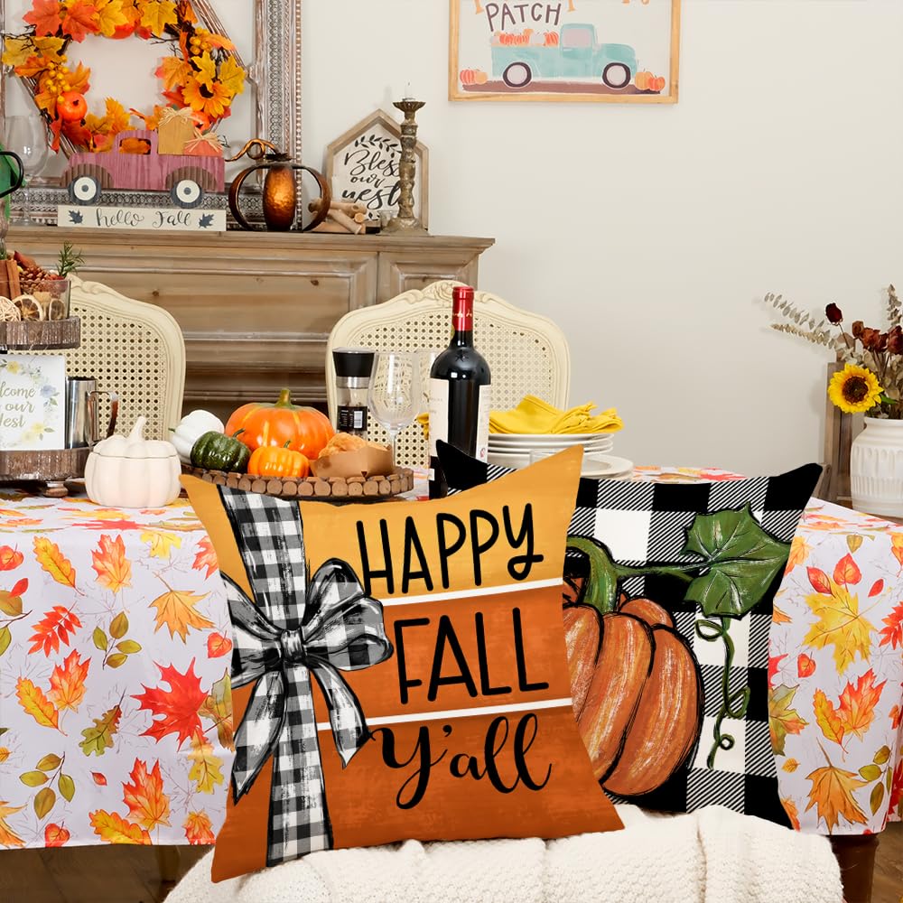 Geeory Fall Pillow Covers 18 X 18 Inch Set Of 4, Buffalo Bowknot Pumpkin Maple Leaf Decorative Throw Cushion Cases Farmhouse Tha