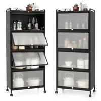 Description: Organize Your Kitchen With Style! Our Rolling Microwave Stand Is The Ultimate Storage Solution. With 5 Tiers And Semi-Translucent Doors, Keep Dust At Bay And Display Your Kitchen Appliances, Tableware, Snacks, And More! Besides, The Door Can Be Retracted To Save Space When Opened, And It Can Be Secured With Magnetic Door Catches When Closed. Plus, 4 Universal Casters Provide Easy Mobility In Any Direction, With 2 Brakes For Maximum Stability. Made With High-Quality Metal Panels And Waterproof Pc Material, This Metal Storage Rack With Sturdy Construction Can Serve For Long! We Even Provide 2 Anti-Tipping Kits To Anchor The Cabinet For Extra Stability And Safety. Upgrade Your Kitchen Storage Today! Features: Top Shelf And 4 Compartments Provide Plenty Of Storage Space Flip-Up Cabinet Doors Can Be Retracted For Saving Space Fitted With Exquisite Silver Knobs And Magnetic Catches For Easy Opening And Closing Semi-Transparent Pc Doors Keep The Mess From Your Sight With 4 Universal Casters And 2 Brakes For Easy Movement Stay Stable When Fitted With Anti-Tipping Device Spacious Top Fitted With Raised Guardrail To Prevent Falling Accidents Specification: Color: Black Material: Metal, Pc, Pp Overall Dimensions: 23.5” X 12.5” X 60.5” (L X W X H) Dimensions Of Each Tier: 22: X 12” X 11.5” (L X W X H) Weight Capacity In Total: 165 Lbs Net Weight: 29 Lbs Package Includes: 1 X Baker’S Rack 1 X Instruction
