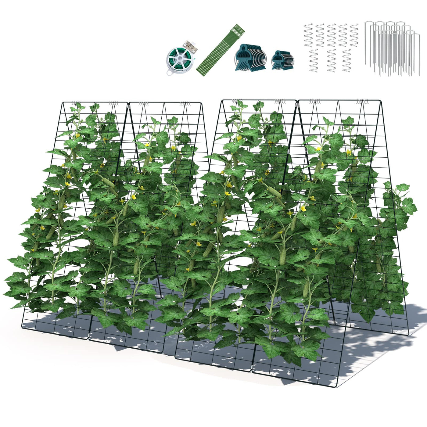 Description: Provide Ideal Growing Support For Your Climbing Plants! Our Garden Cucumber Trellis Set Includes 8 Trellises For Freely Combinations, Whether You Want An A-Shaped Climbing Frame Or A Rectangular-Shaped Climbing Frame, It Is Easy To Assemble By Rotating Spring Connectors And Buckles. Besides, The Wires Are Made Of Premium Steel Material That Is Rustproof And Weather-Resistant, Allowing For Long-Term Outdoor Uses. The Plant Growing Support Is Ideal For Climbing Plants, Especially For Heavier Fruits And Vegetables To Grow In The Desired Direction. In Addition, The Stable A-Shaped Frame Allows You To Plant A Row On Both Sides And Allows Plants To Obtain Even Sunshine And Rain. Features: Get Sufficient Sunlight, Promote Air Circulation, And Grow Healthily Constructed Of Rust-Resistance Steel Wires, Durable For Long-Lasting Outdoor Uses Features 2 Installation Ways: A-Shaped And Rectangular-Shaped Climbing Frame Easy To Install And Change Shape By Rotating Spring Connectors And Buckles Ideal For Planting Fruits, Vegetables, Flowers, Virginia Creeper, And More Comes With A Garden Twist Tie, Cable Ties, And Flexible Clips To Fix Plants And Trellises The Ground Stakes Help Fix Trellises And Ensure Stability Help Save Places For Planting And Make Plants Grow In The Desired Direction The Height And Width Of The A-Shaped Climbing Frame Can Be Adjusted Equipped With Straightforward Instructions And Assembly Video For Quick Setup Specification: Color: Green Material: Steel, Pp Sizes Of One Panel: 50.5' X 17'(L X W) Garden Twist Tie Length: 65.5 Ft Net Weight: 13 Lbs Package Included: 2 X Cucumber Trellis (8 Panels) 9 X Big Clip 9 X Small Clip 16 X Ground Stake 8 X Spiral Connector 12 X Cable Tie