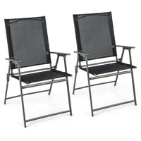 Description: Comfortable In Unfolding And Convenient In Folding With Our 2 Pieces Outdoor Patio Chairs! For Comfort, These Outdoor Folding Chairs Feature High Backrests, Cozy Armrests And Deep Seats. Meanwhile, The Breathable And Fast-Drying Fabrics Are Designed For Extra Comfort. Therefore, You Can Sit On These Patio Chairs Cozily. During Sitting, The Sturdy And Anti-Rust Metal Frames As Well As Security Locks Will Endow These Outdoor Dining Chairs With Higher Stability And Safety. If You Wanna Fold These Chairs, Just Lift The Security Locks For Easy Folding. Features: Sturdy And Anti-Rust Metal Frame For 330 Lbs Weight Capacity Non-Slip Foot Pads For Extra Stability And Floor Protection Folding Design For Easy Storage And Space-Saving Hassle-Free To Move As Well Thanks To The Portable Design Keep Them Stable While Making Them Fold Easily Thanks To The Security Locks Selected Fabric For Breathability And Quick-Drying Cozy To Sit With High Backrests, Cozy Armrests And Deep Seats Suitable For Various Occasions, Such As Backyard, Deck And Camping No Need To Assemble Specifications: Color: Black And Gray Material: Metal, Fabric Unfolding Dimension Of Each Chair: 24” X 23” X 38” (L X W X H) Folding Dimension Of Each Chair: 35” X 23” X 2” (L X W X H) Seat Height From The Ground: 17” Net Weight Of Each Chair: 9 Lbs Weight Capacity Of Each Chair: 330 Lbs Package Includes: 2 X Chairs 1 X Instruction