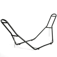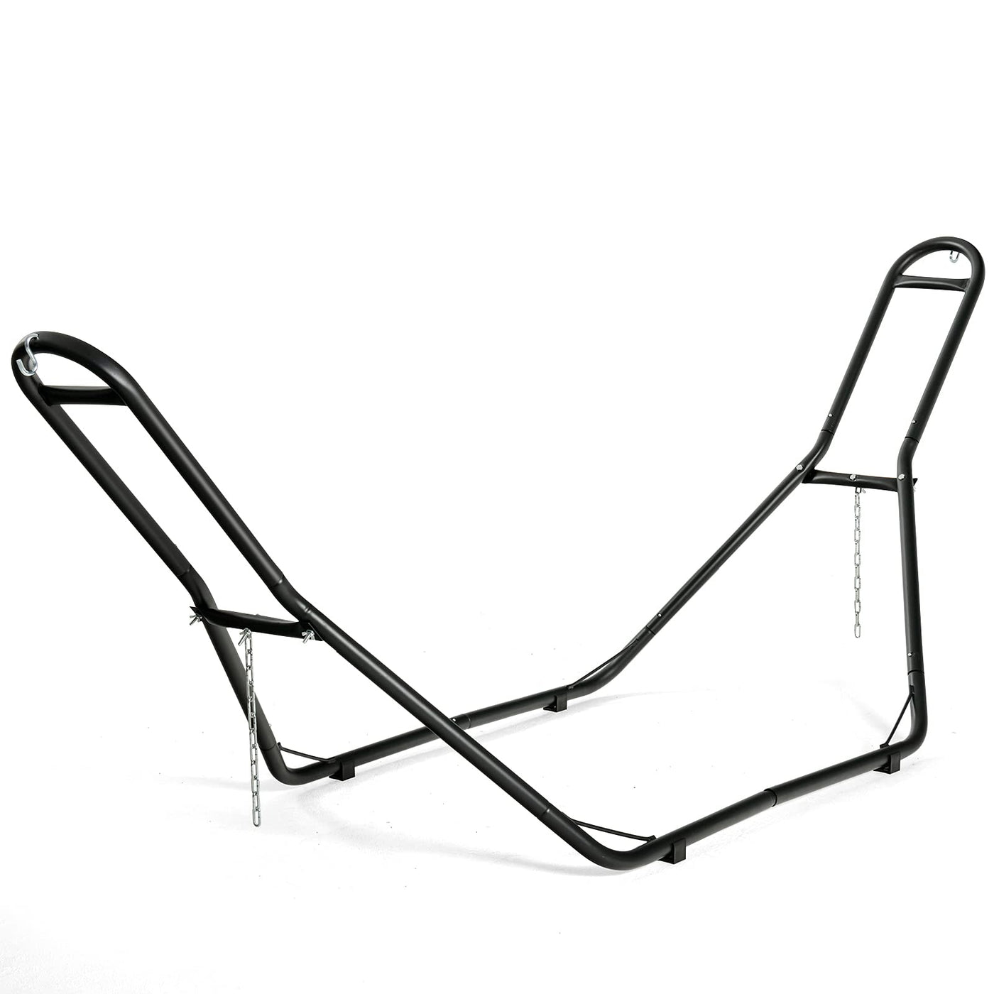 Description: Our Hammock Stand Provides You With Convenience When You Desire To Have A Rest On The Hammock. With 2 Adjustable Chains And 2 S-Hooks, It Is Able To Hang Different Kinds Of Hammocks. The Stand Made Of Premium Steel Is Weather-Resistant And Rust-Resistant, Enabling You To Use It For A Long Time. Thus, It Is Ideal For Patio, Courtyard, Garden And Deck. Featuring Heavy Duty Steel Frame, It Has A Weight Capacity Up 550Lbs, Which Is Safe For You To Use. Besides, Plastic Pads Keep It Stable And Protect The Floor From Scratching. Besides, Its Light Weight And Detachable Design Allow You To Carry It To Any Destination. Detailed Instruction And All Necessary Accessories Simplify The Installation Process. Features: 2 Adjustable Chains And 2 S-Hooks To Fit Different Hammocks Suitable For Many Places, Including Patio, Courtyard, Garden, Deck And Bedroom Powder-Coated Steel Makes It Rust-Resistant And Durable Heavy-Duty Steel Frame Ensures High Stability And Sturdiness Plastic Pads Benefit The Floor Protection Lightweight And Detachable Structure Allow You To Move And Store It Easily Easy-To-Understand Instruction And Complete Accessories Make It Easy To Assemble Specifications: Color: Black Material: Steel Overall Dimension: 110' X 37.5' X 45' (L X W X H) Net Weight: 32Lbs Load Capacity: 550Lbs