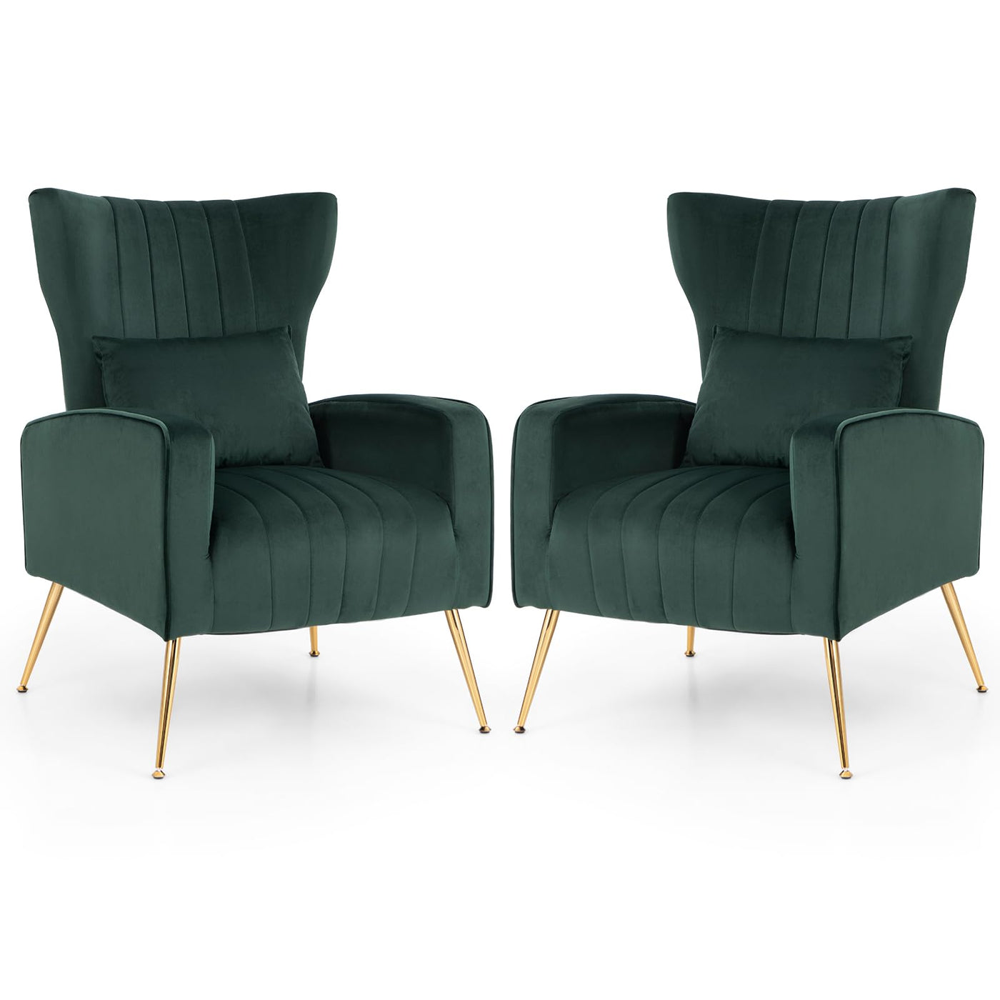 Giantex Velvet Accent Chair Set Of 2, Upholstered Tufted Wingback Arm Chair W/Lumbar Pillow, Golden Metal Legs, Mid Century Modern Single Sofa Chair For Living Room Bedroom, Max Load 400 Lbs, Green