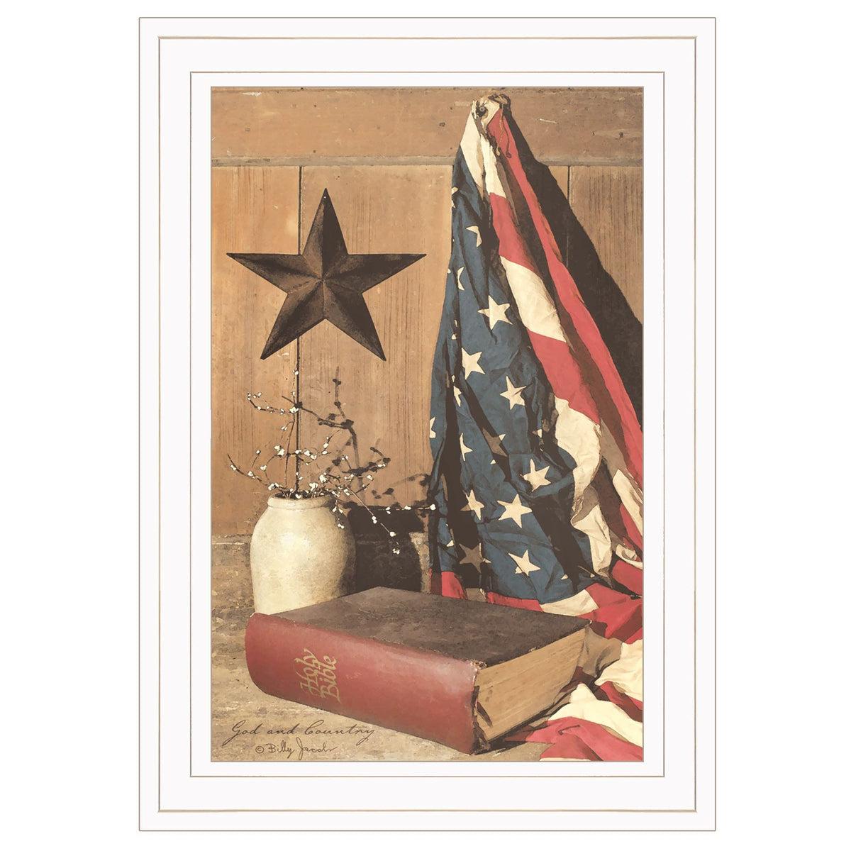 The god and country 1 white framed print wall art is the perfect decorative accessory for your home. This print is a visual artistic expression that allows you to decorate your space in reproduced for you on style. This hanging decorative accent will be a trendy and fashionable way to dress your wall. Adding this hanging wall art to your space to make your room feel more finished and attractive. Instantly liven up your space with this art that brings color dimension to your home. 5' H x 1 1' W x 1' D