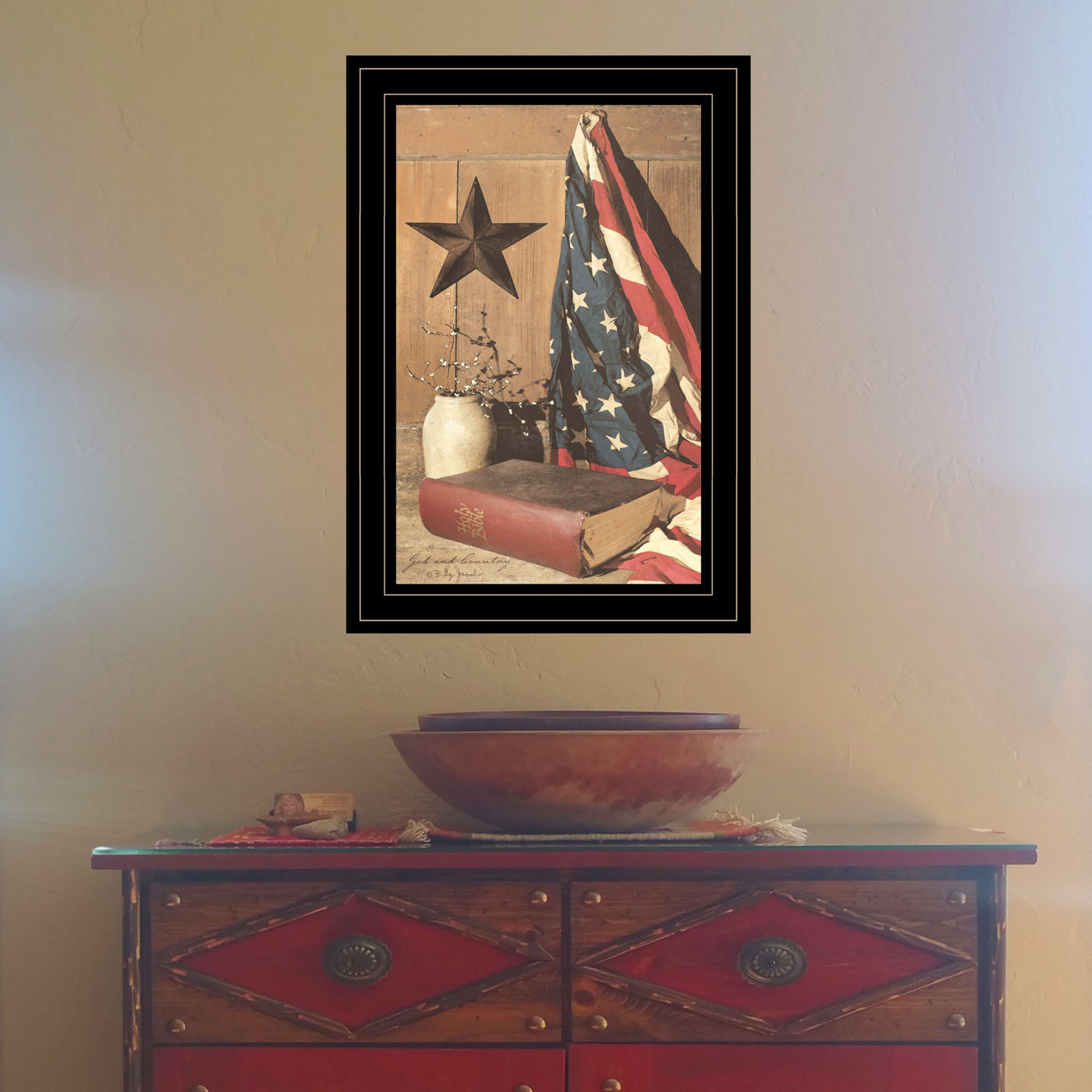 Unique and decorative, this god and country 3 black framed print wall art will leave a lasting impression. This print is a visual artistic expression that allows you to decorate your space in restyle. Made for you on paper, this hanging decorative accent will be a trendy and fashionable way to dress your walls. Hang on your wall to add up to date fashion and decoration. Instantly liven up your space with this art that brings color and dimension to your walls. 15' H x H 11' W x 1' D