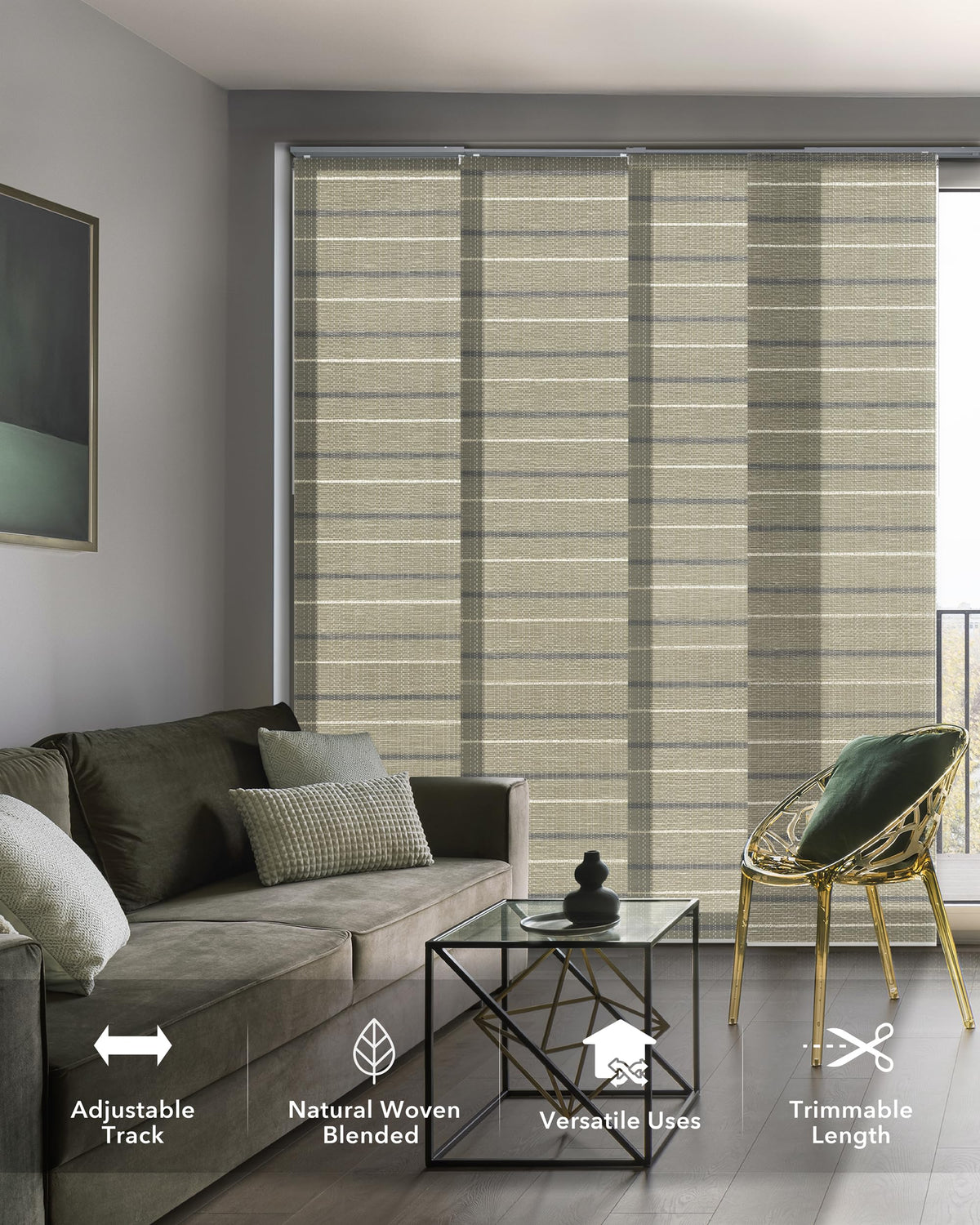 Q: What materials are used in the construction of these blinds?A: The GoDear panel track blinds feature high-quality woven fabric panels designed for durability, and they come with a sturdy 4-rail track system.
