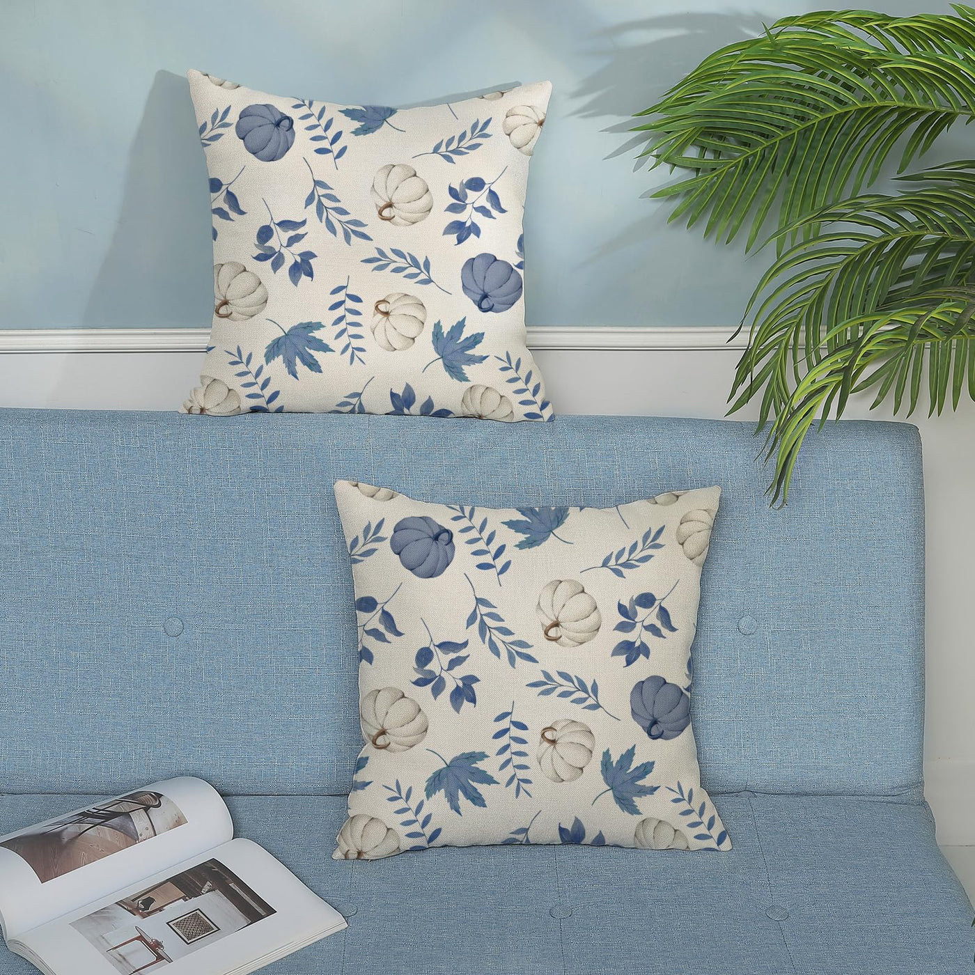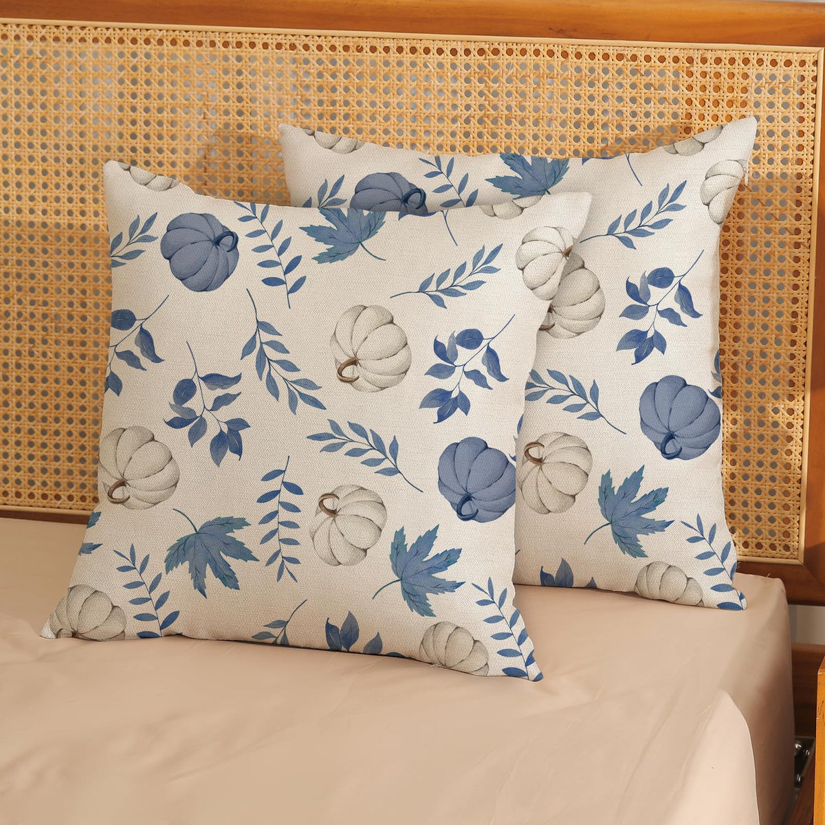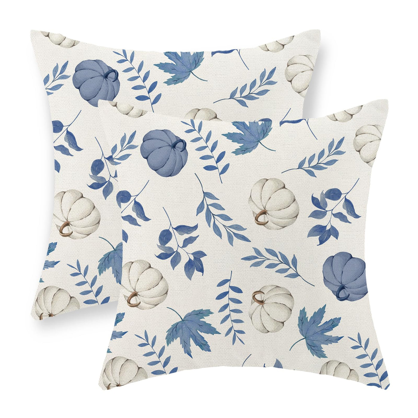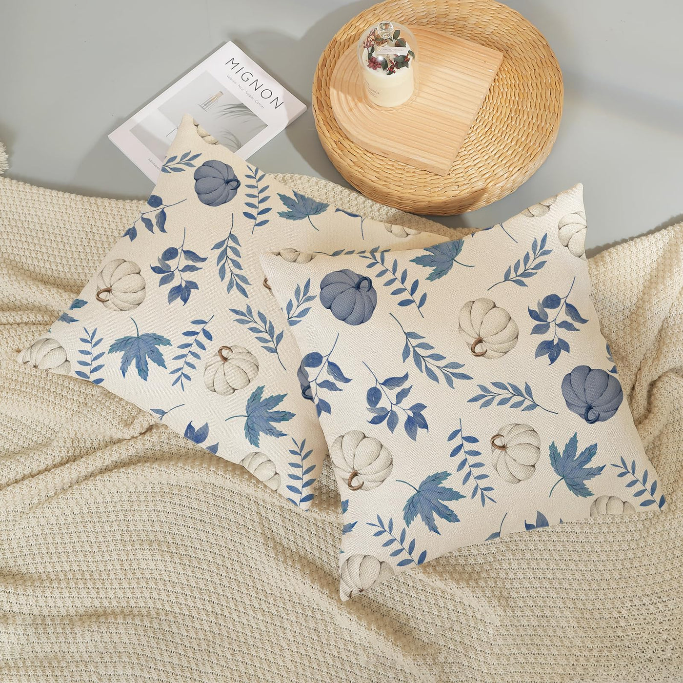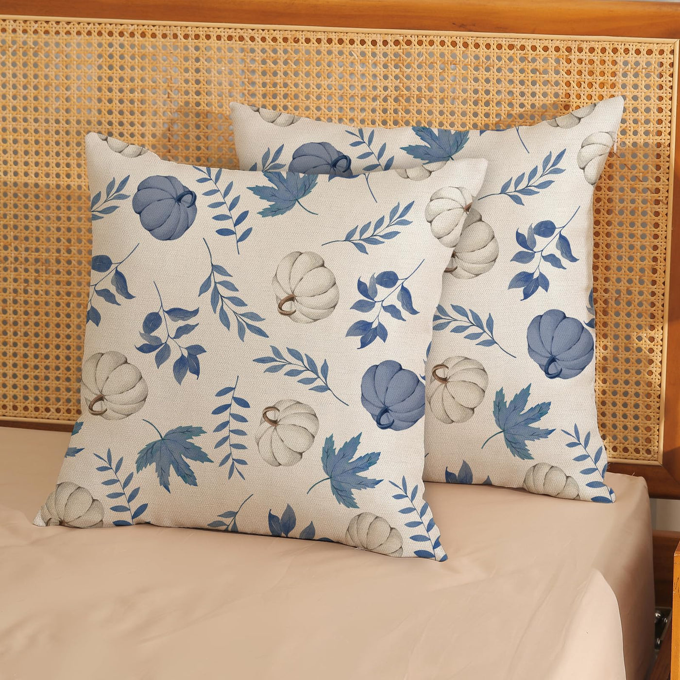 Gohdiwh Fall Pillow Covers 18X18 Inch Set Of 2 Light Blue White Pumpkin Maple Leaf Fall Decor Pillowcase Autumn Thanksgiving Dec