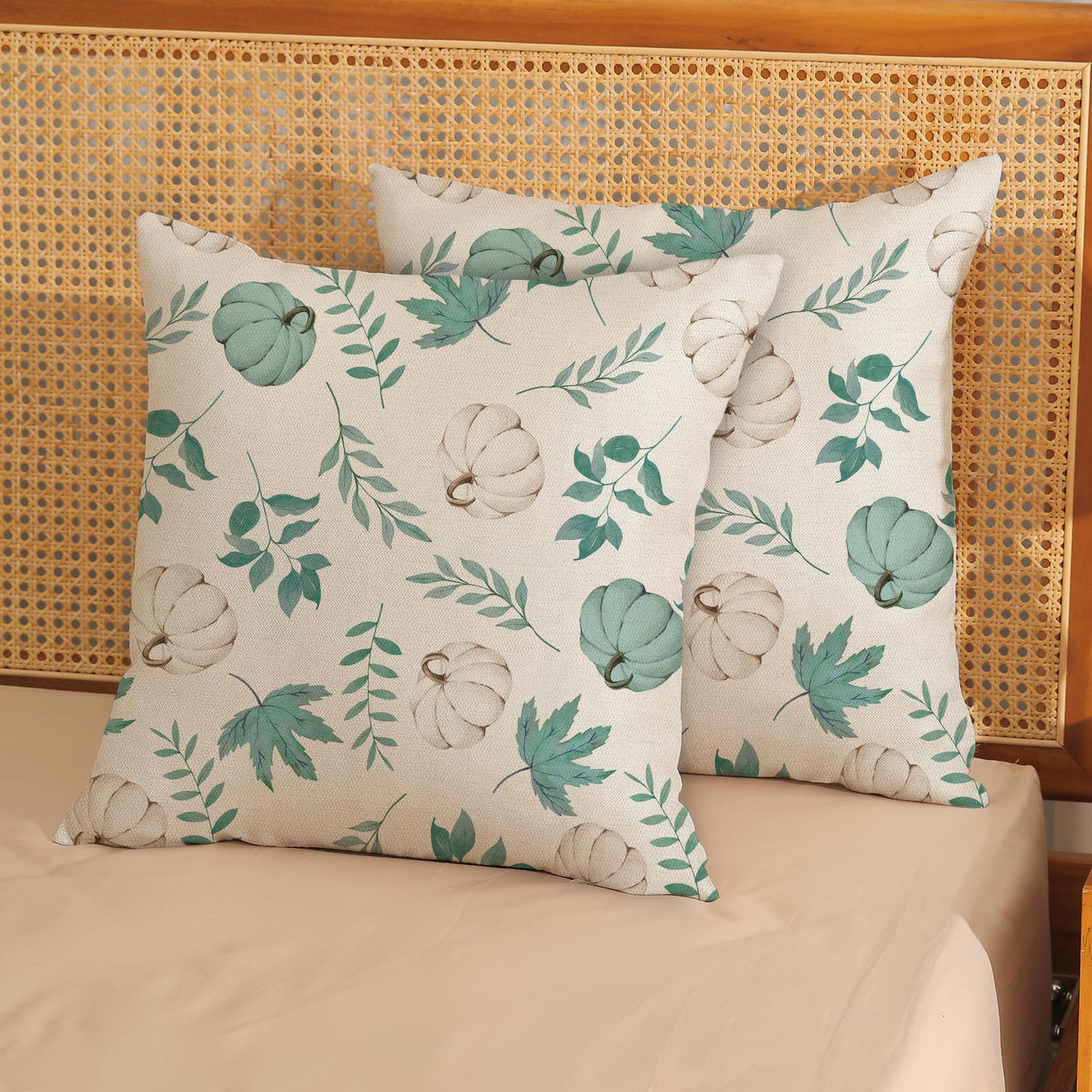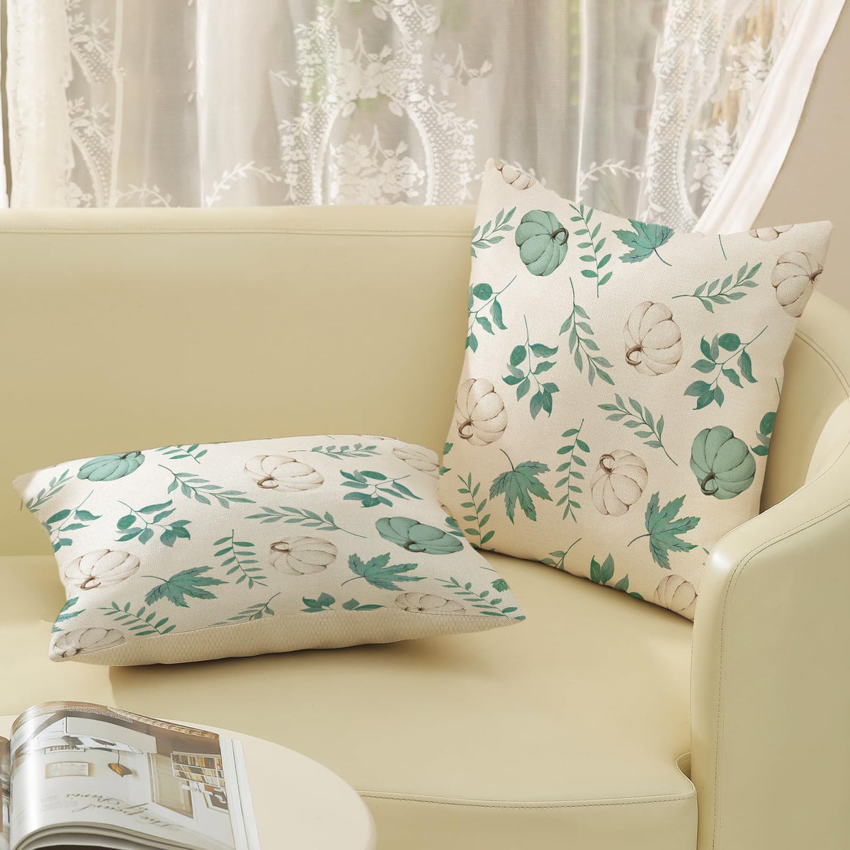 Gohdiwh Fall Pillow Covers 18X18 Set Of 2 Aqua Green White Pumpkin Maple Leaves Pillowcase For Home Fall Decor Throw Pillow Cove