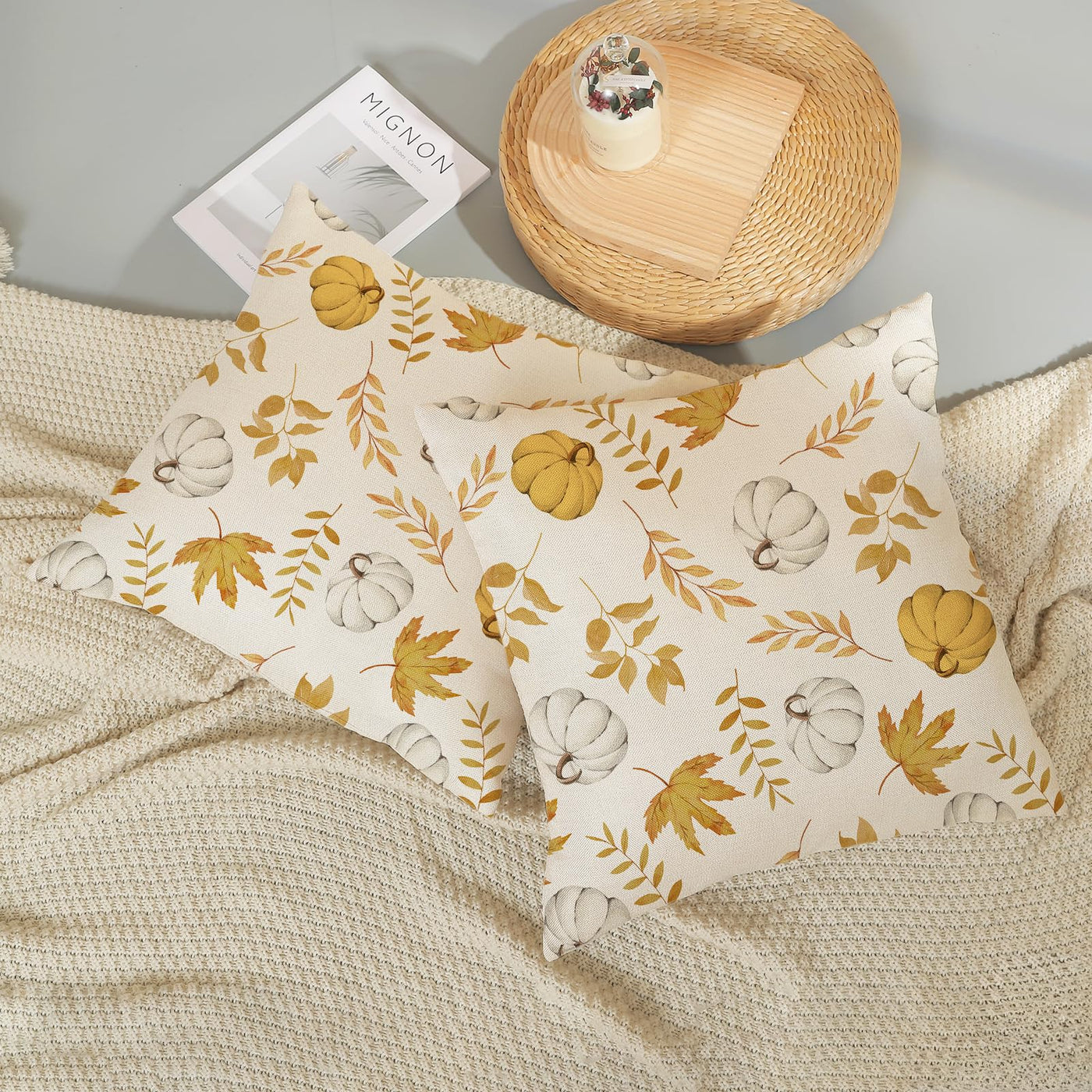 Q: Are these pillow covers a good gift for Thanksgiving?A: Absolutely! These pillow covers feature a charming yellow and white pumpkin and maple leaves design, making them an excellent gift choice for Thanksgiving, Halloween, or as a seasonal home decor item.