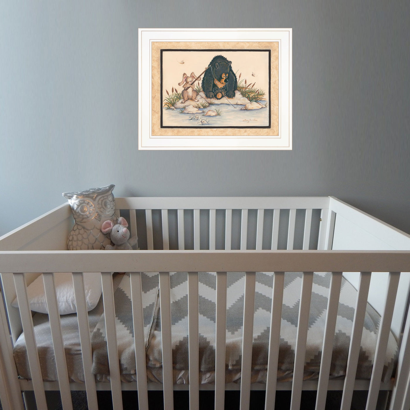 The gone fishing 1 white framed print wall art is the perfect decorative accessory for your home. Update your walls with this woodland animal decor. This print is a visual artistic expression that allows you to decorate your space in style. Reproduced for you on paper, this hanging decorative accent will be a trendy and fashionable way to dress your walls. Hang on your wall to add some up to date fashion and decoration. Instantly liven up your space with this art that dimension brings color to your dimension and to your color to your day. Walls: 15' H x 19' W x 1' D