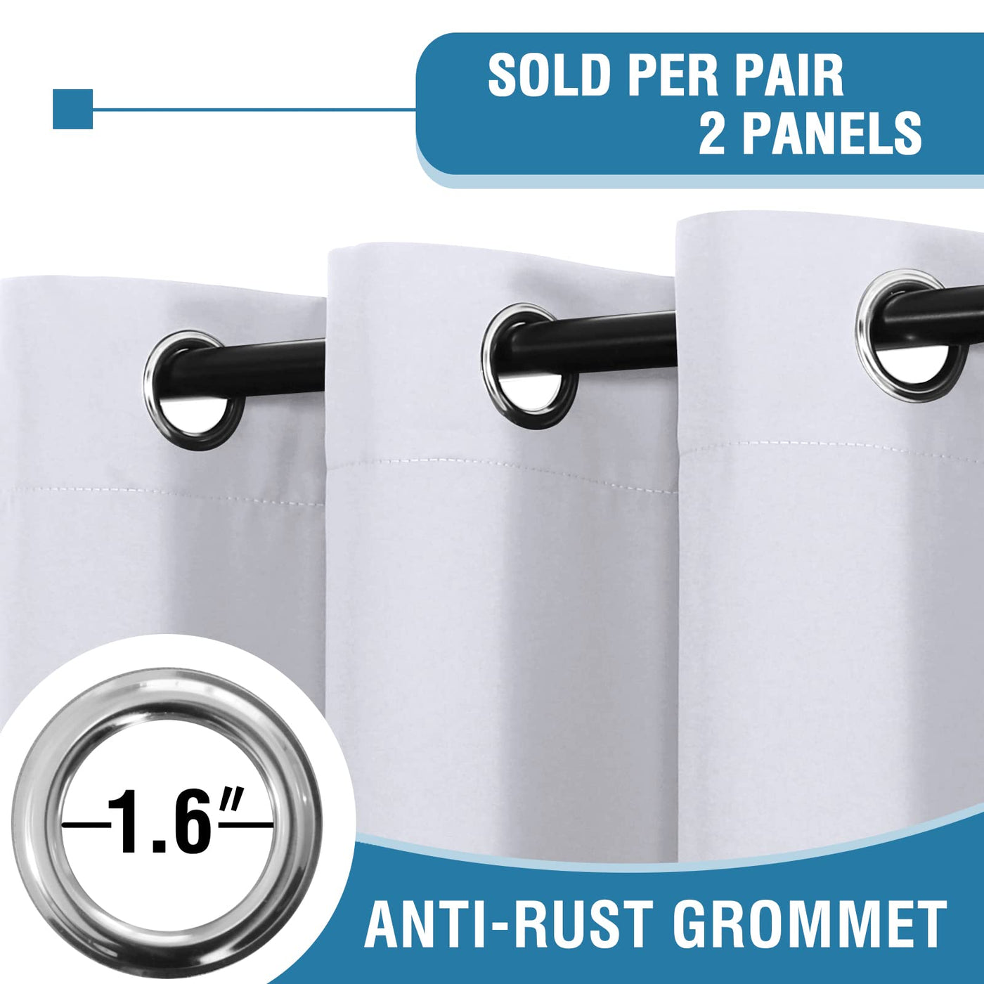 Q: What type of curtain rods are compatible with these curtains?A: The curtains feature 6 anti-rust grommets with an inner diameter of 1.6 inches, making them compatible with standard or decorative curtain rods.