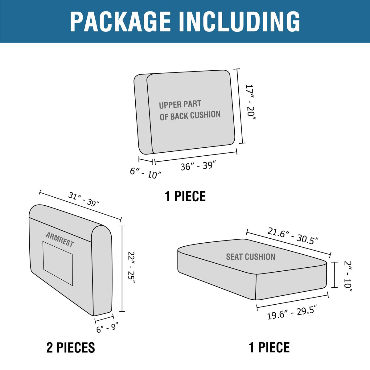 Q: What sizes do the H.VERSAILTEX chair covers fit?A: The H.VERSAILTEX multi-piece chair covers are designed to fit sofas that are 31 to 47 inches wide. The armrest covers accommodate widths of 6-9 inches, while the seat cushion covers fit widths of 19.6-29.5 inches. For the back cushion, the size fits widths of 36-39 inches.