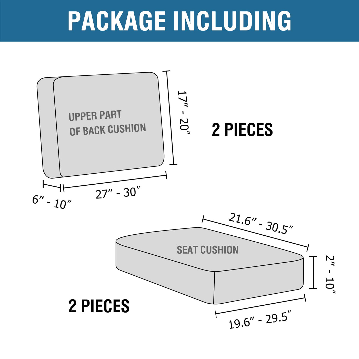Q: What sizes do the H.VERSAILTEX loveseat covers fit?A: The loveseat covers are designed to fit seat cushions up to 19.6-29.5 inches in width, 21.6-30.5 inches in depth, and 2-10 inches in thickness. The back cushion covers fit cushions that are 27-30 inches wide, 6-10 inches deep, and 17-22 inches thick.