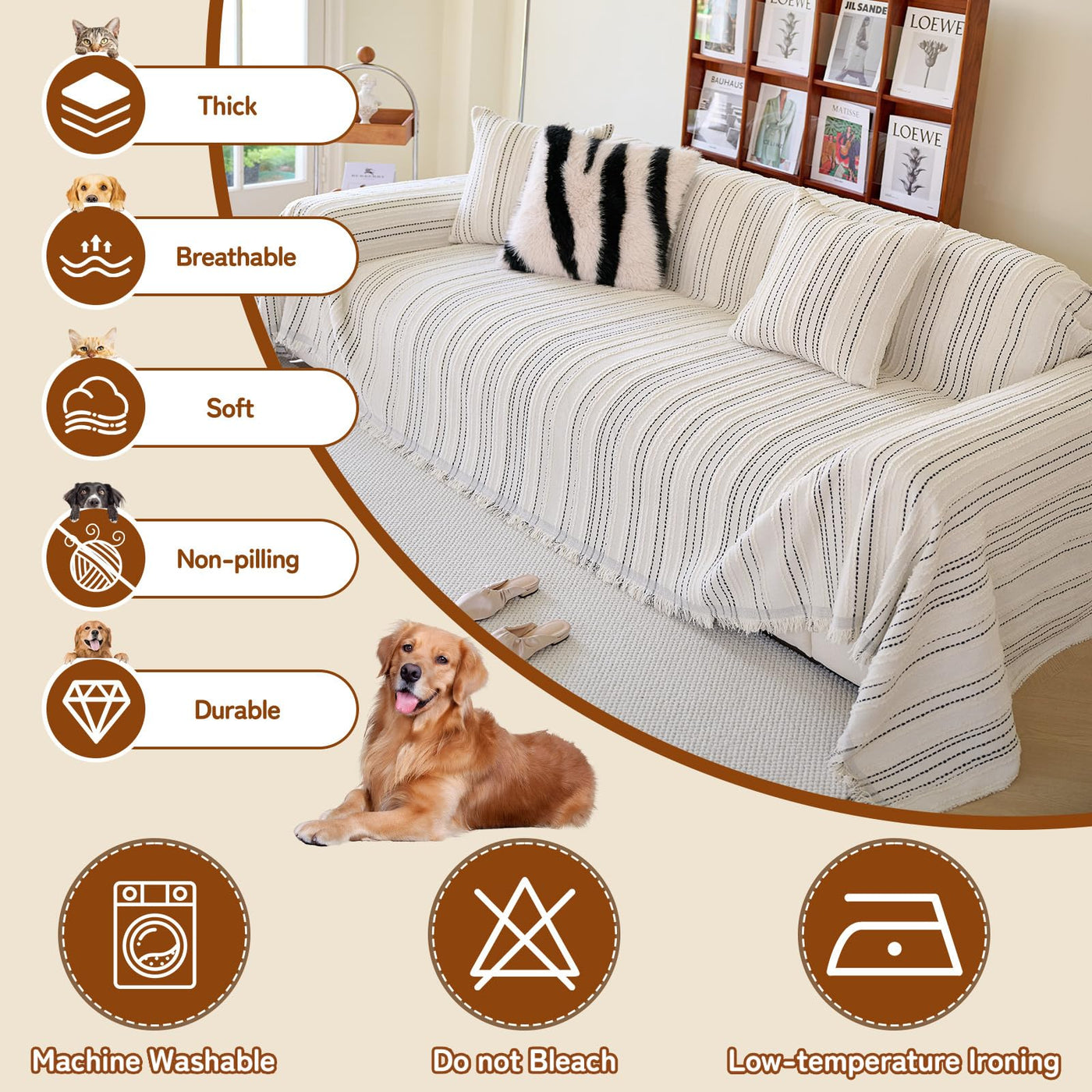 Q: What benefits does the HANDONTIME Couch Cover provide for pet owners?A: The HANDONTIME Couch Cover effectively keeps out stains, dirt, and scratches from pets while also providing a comfortable surface for both your family and pets. It's a cost-effective way to give your old sofa a new look.