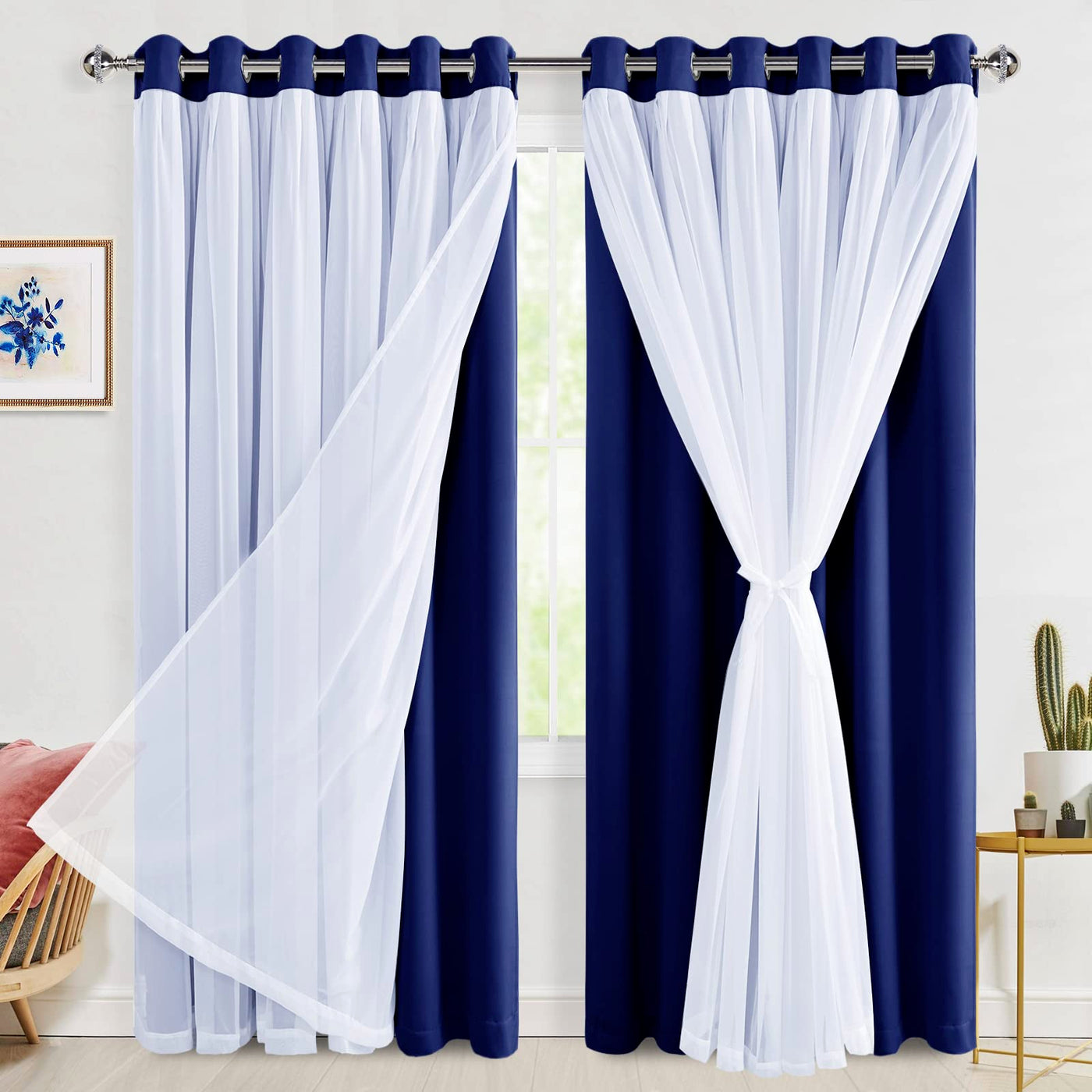 Hiasan Blackout Curtains With Sheer Overlay 84 Inches Long, Thermal Insulated Double Layer Window Curtains For Bedroom, Living R