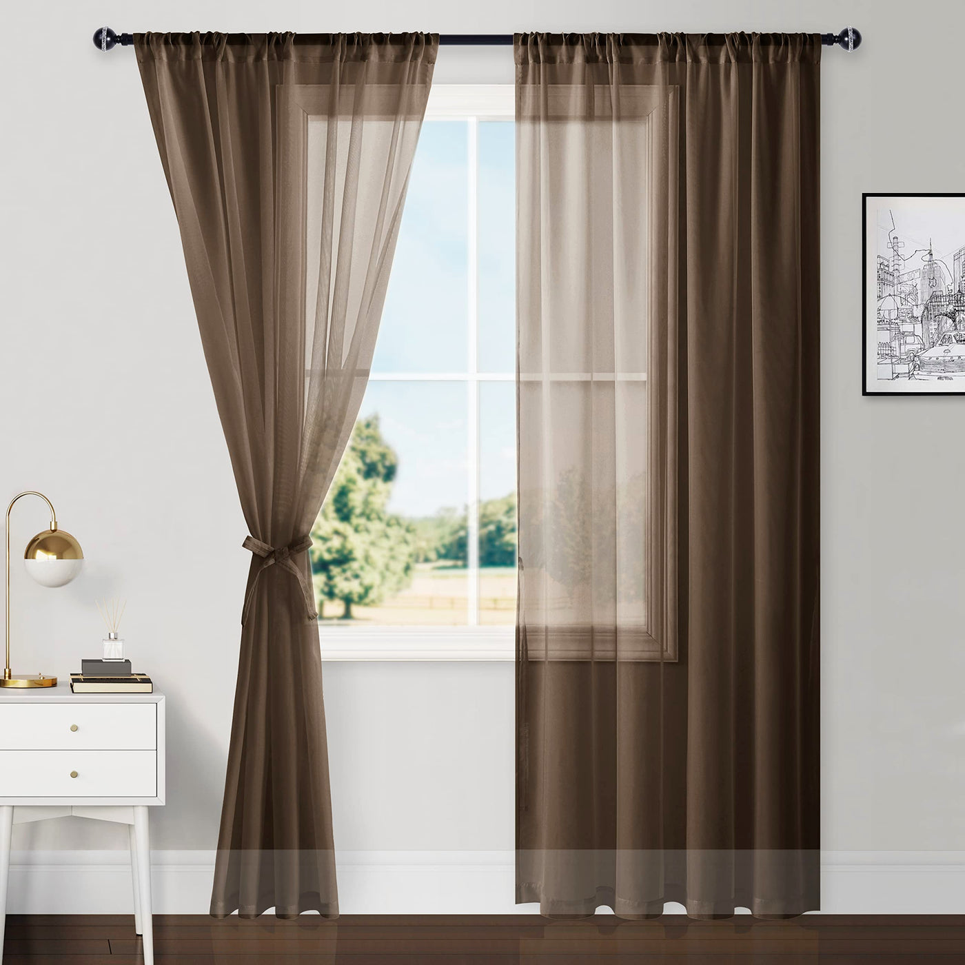 Hiasan Brown Sheer Curtains 84 Inches Long With Tiebacks, Light Filtering Voile Drapes Rod Pocket Window Curtains For Bedroom, L