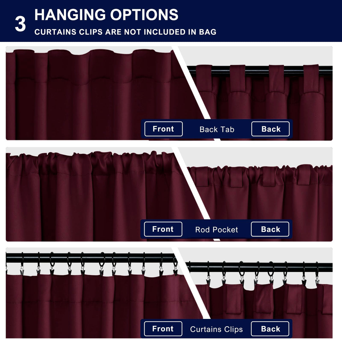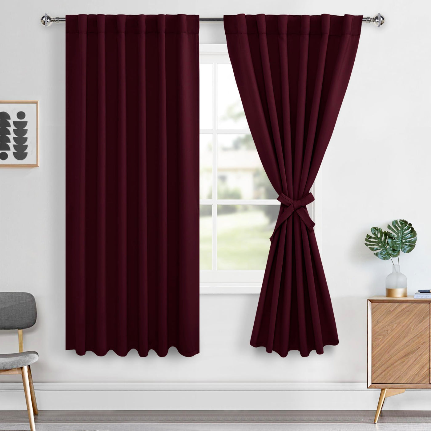 Hiasan Christmas Curtains 63 Inch Long Sewn With Tiebacks, Rod Pocket & Back Tab Blackout Thermal Insulated Burgundy Red Drapes,