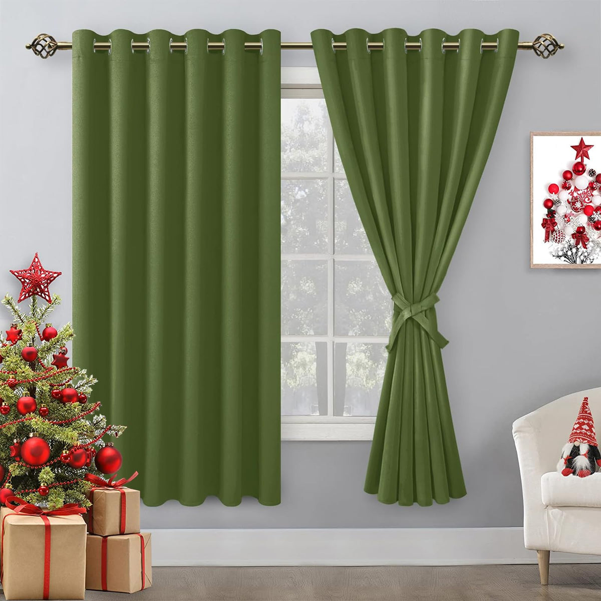 Hiasan Christmas Room Darkening Curtains For Bedroom, 70 X 63 Inches - Thermal Insulated & Energy Saving Window Drapes For Living Room/Dorm Room, Set Of 2 Panels Sewn With Tiebacks, Olive Green