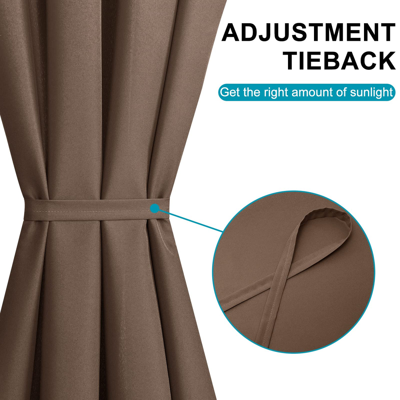 Each door panel has an adjustable tieback that adjusts the tieback according to the need for light. It can block part of the sunlight and harmful UV rays to protect the furniture from the sun.