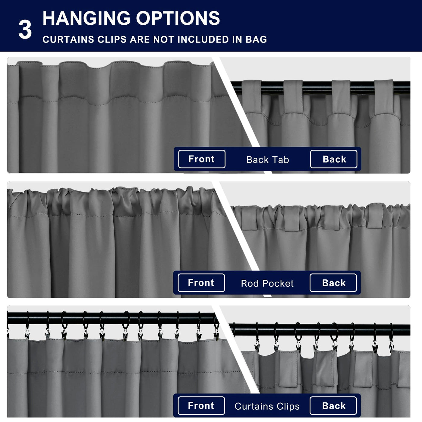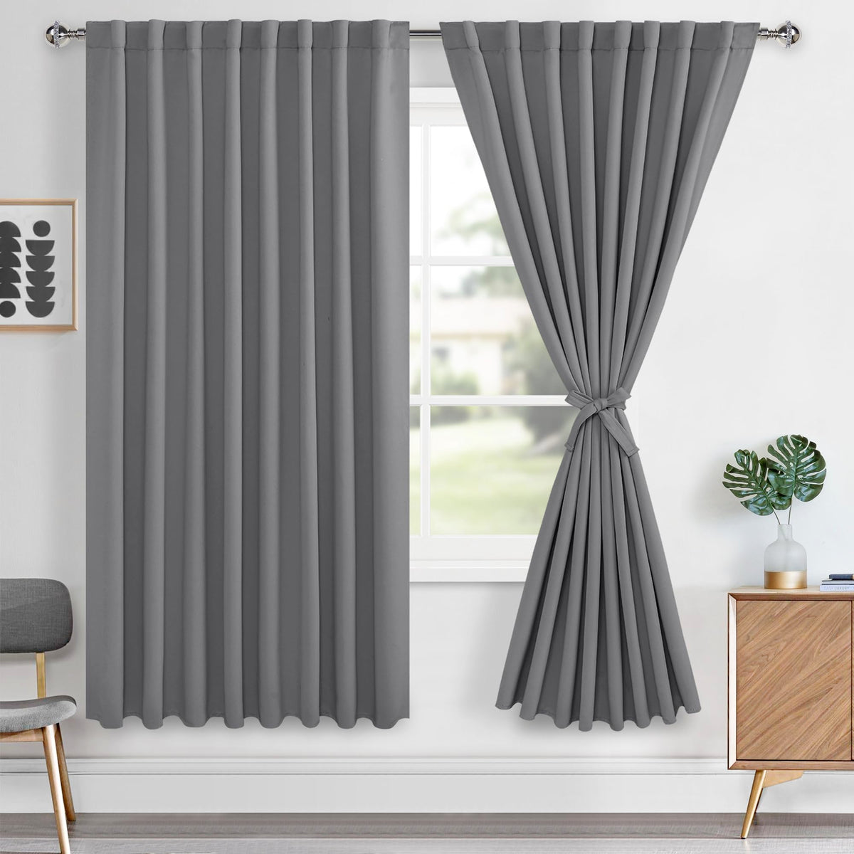 Hiasan Grey Curtains 63 Inch Long Sewn With Tiebacks, Rod Pocket & Back Tab Gray Blackout Thermal Insulated Drapes, Room Darkeni