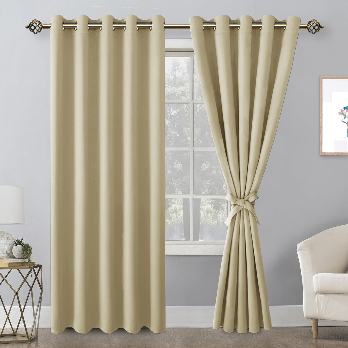 Hiasan Grommet Blackout Curtains For Bedroom, 70 X 84 Inches - Thermal Insulated & Light Blocking Window Drapes For Living Room/Dorm Room, Set Of 2 Panels Sewn With Tiebacks, Light Beige