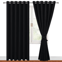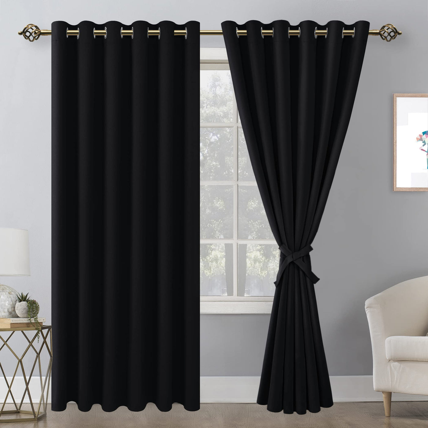 Hiasan Grommet Blackout Curtains For Bedroom, 70 X 84 Inches - Thermal Insulated & Noise Reducing Window Drapes For Living Room/Dorm Room, Set Of 2 Panels Sewn With Tiebacks, Black