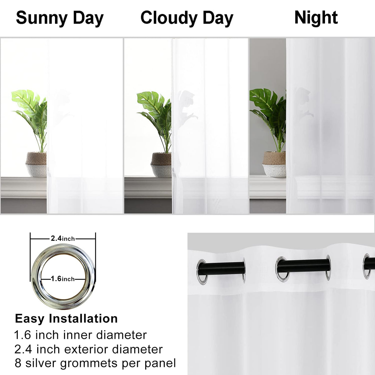 Featuring high quality closely woven fabric, our voile sheer curtains are soft and durable enough. 8 silver grommets per panel make it easy to install and fit up to any standard rods. These light filtering window curtains can diffuse harsh sun light and lets in soft light, creating a breathable cozy environment. Using our gauzy sheer curtains adding elegance to your room while effectively maximizing privacy. Our lightweight sheer curtains are perfect for living room, bedroom, nursery, girls’ room, home decor and any other occasion. The premium polyester fabric is machine washable, tumble dry and iron at low temperature (if needed).