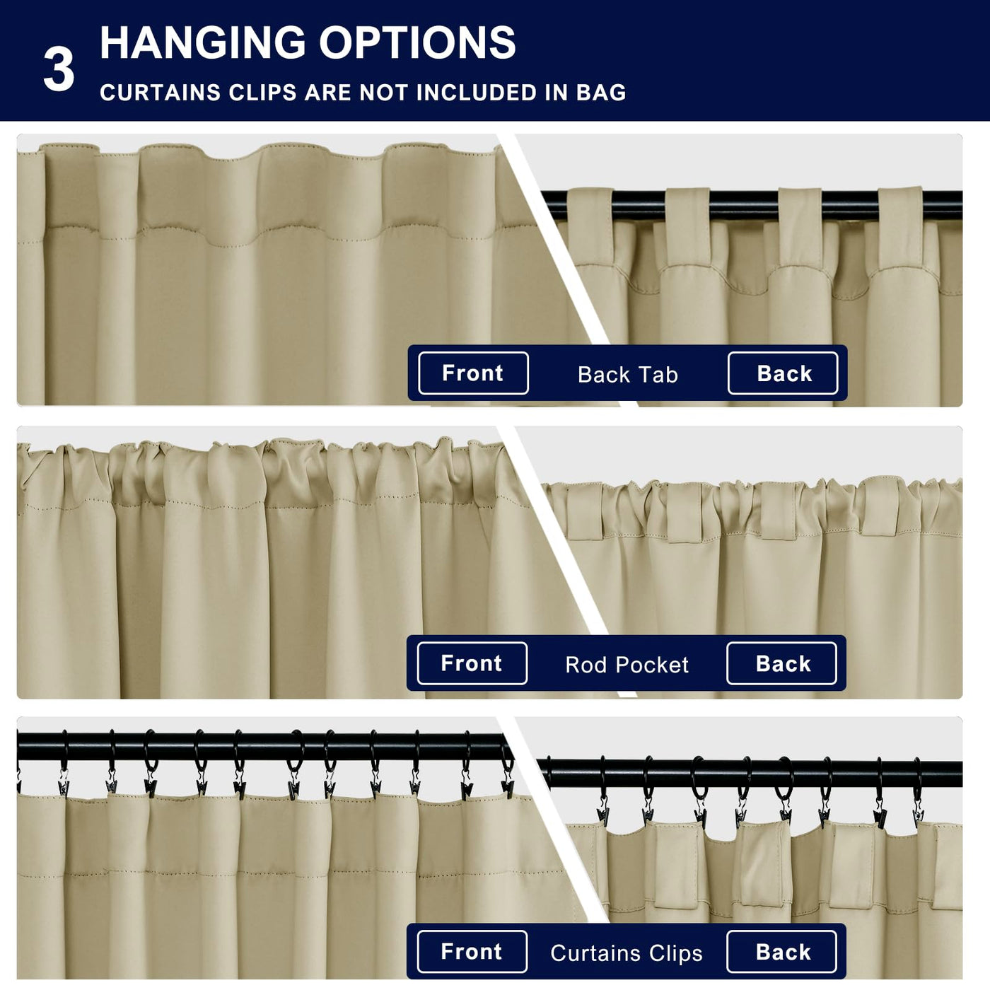 Q: How do I install these curtains?A: You can install the Hiasan curtains using three hanging styles: back loops, rod pocket, or with your own clip-rings, providing flexibility to match your decor.