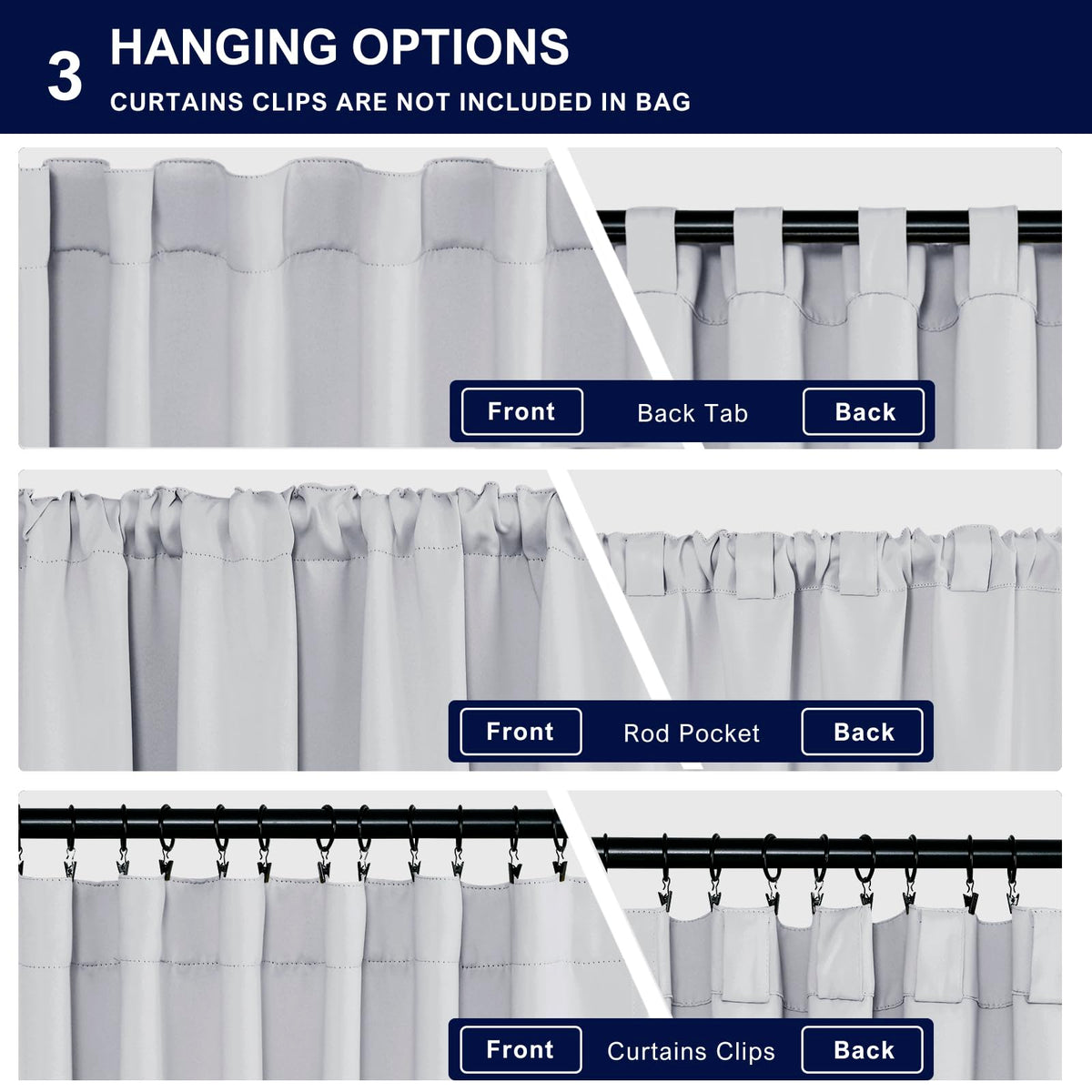 Q: How do I hang these curtains?A: These curtains offer three hanging styles: back loops, rod pocket, or you can use your own clip rings, allowing you to choose the method that best suits your decor.