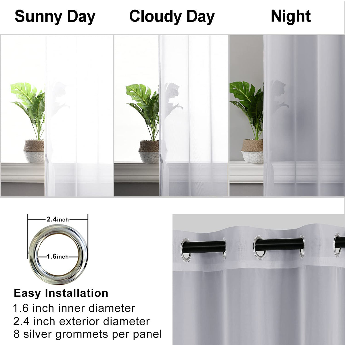 Featuring high quality closely woven fabric, our voile sheer curtains are soft and durable enough. 8 silver grommets per panel make it easy to install and fit up to any standard rods. These light filtering window curtains can diffuse harsh sun light and lets in soft light, creating a breathable cozy environment. Using our gauzy sheer curtains adding elegance to your room while effectively maximizing privacy. Our lightweight sheer curtains are perfect for living room, bedroom, nursery, girls’ room, home decor and any other occasion. The premium polyester fabric is machine washable, tumble dry and iron at low temperature (if needed).
