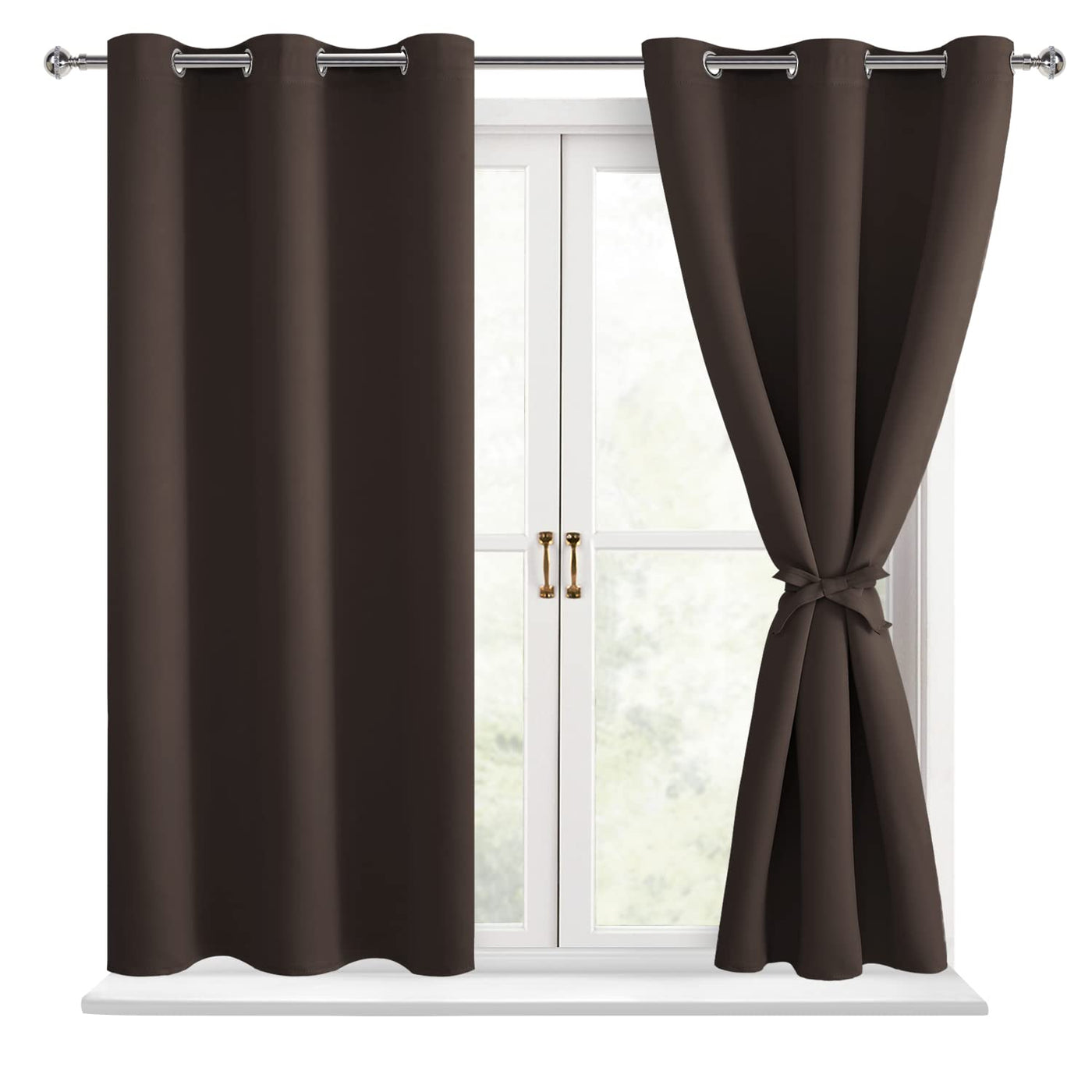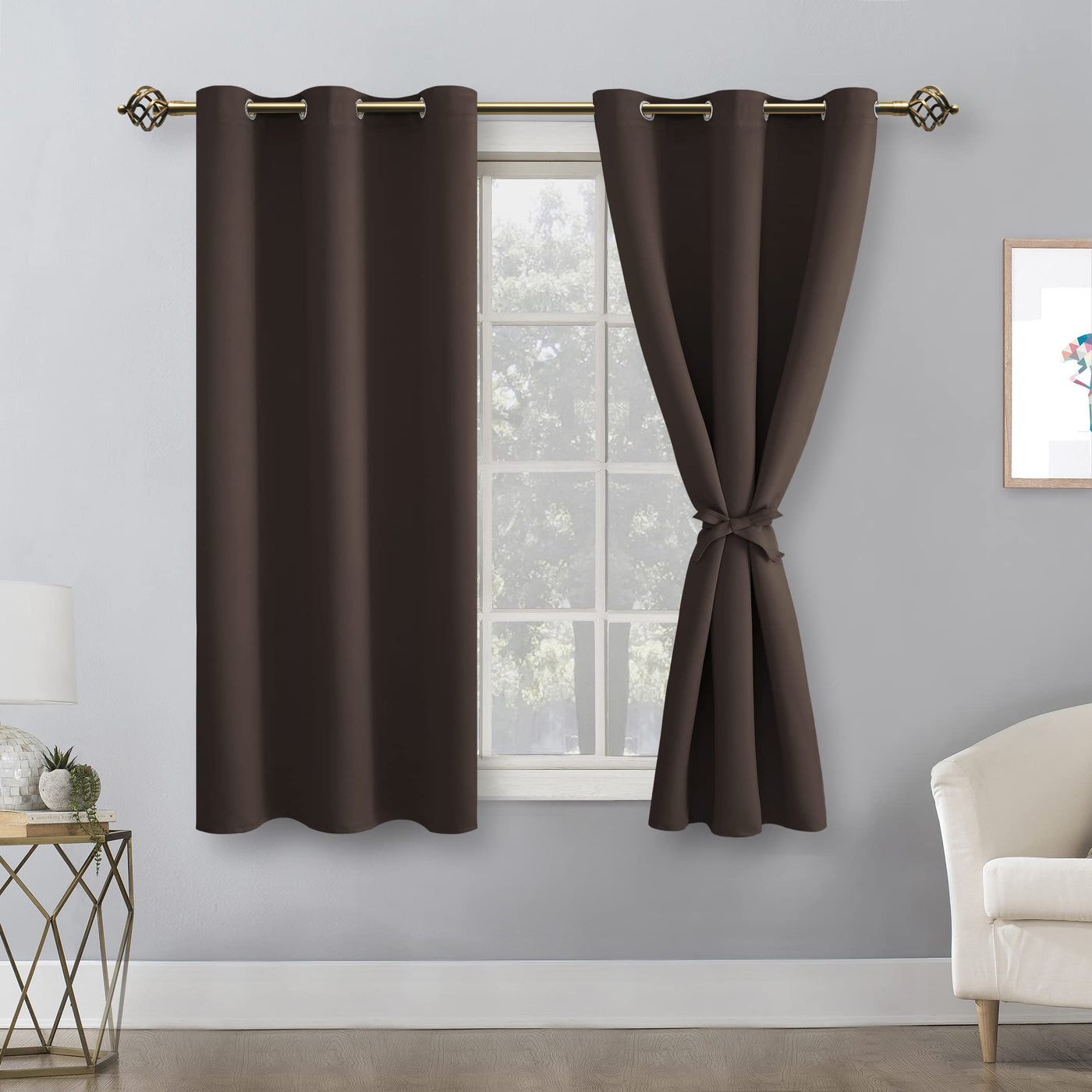 Hiasan Short Blackout Curtains For Bedroom - Thermal Insulated & Light Blocking Window Curtains For Living Room, 2 Drape Panels Sewn With Tiebacks, Brown, 42 X 45 Inch