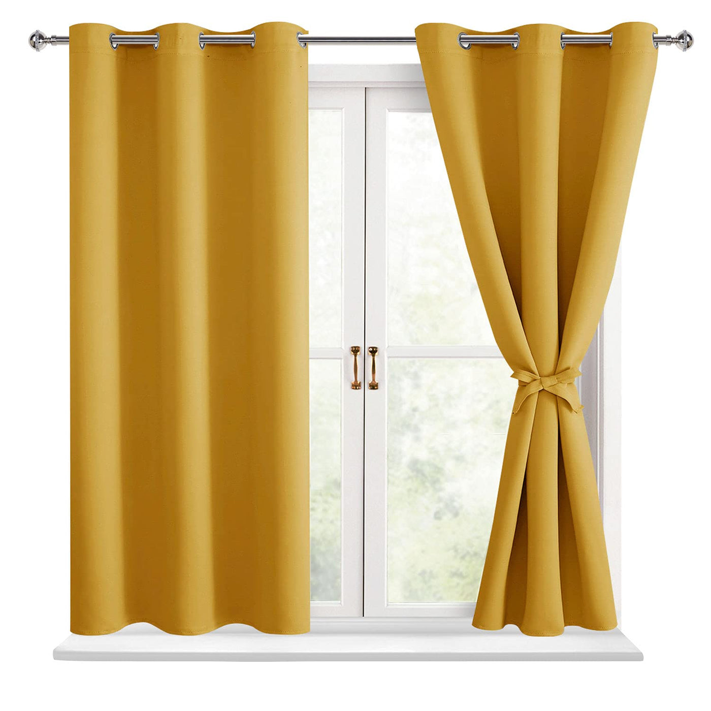 Hiasan Short Blackout Curtains For Bedroom - Thermal Insulated & Light Blocking Window Curtains For Living Room, 2 Drape Panels Sewn With Tiebacks, Mustard Yellow, 42 X 45 Inch
