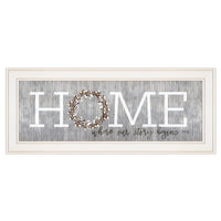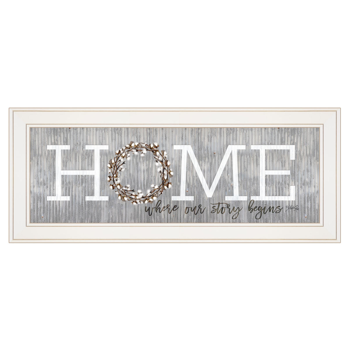 Add an air of fashion to your room and rejuvenate the space with this home-where our story begins white framed print wall art. This print is a visual artistic expression that allows you to decorate your space in style. Reproduced for you on paper, this hanging decorative accent will be a trendy and fashionable way to dress your walls. Hang on your wall to add some up to date fashion and decoration. Utilize this opportunity to create a focal point in this room with this room with this room fabulous wall decor option. 11' H x 27' W x 1' D