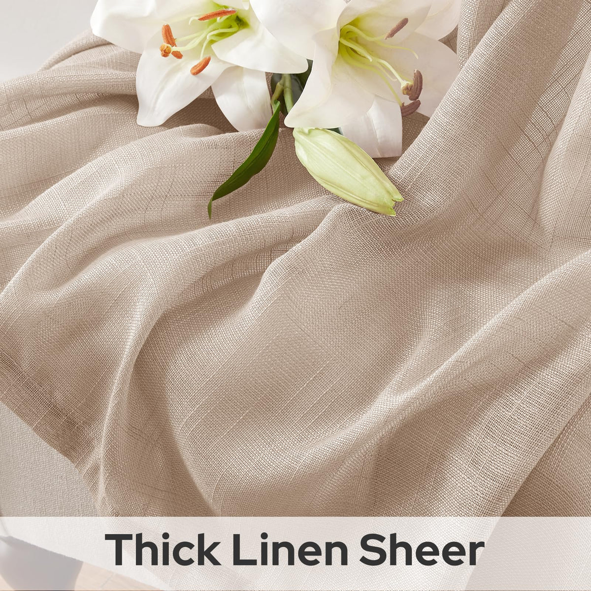 Q: What material are these curtains made of?A: These curtains are made of high-quality polyester that mimics the textured feel of linen, providing durability while maintaining a semi-sheer appearance.