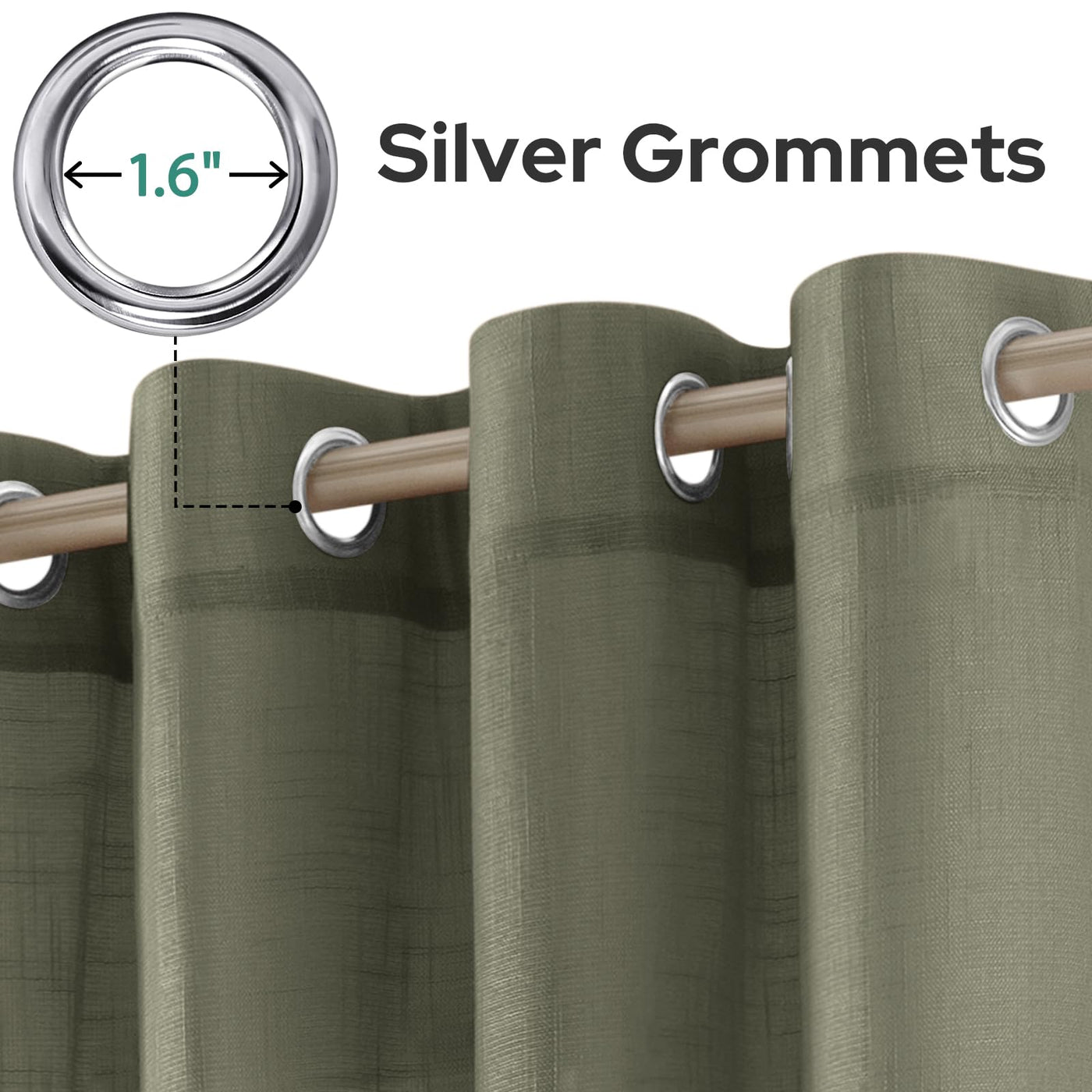 Q: Do the curtains come with grommets, and what is their size?A: Yes, each panel features 8 silver stainless steel grommets that are easy to install and remove. The grommet size is approximately 1.6 inches in diameter, fitting most standard window rods.