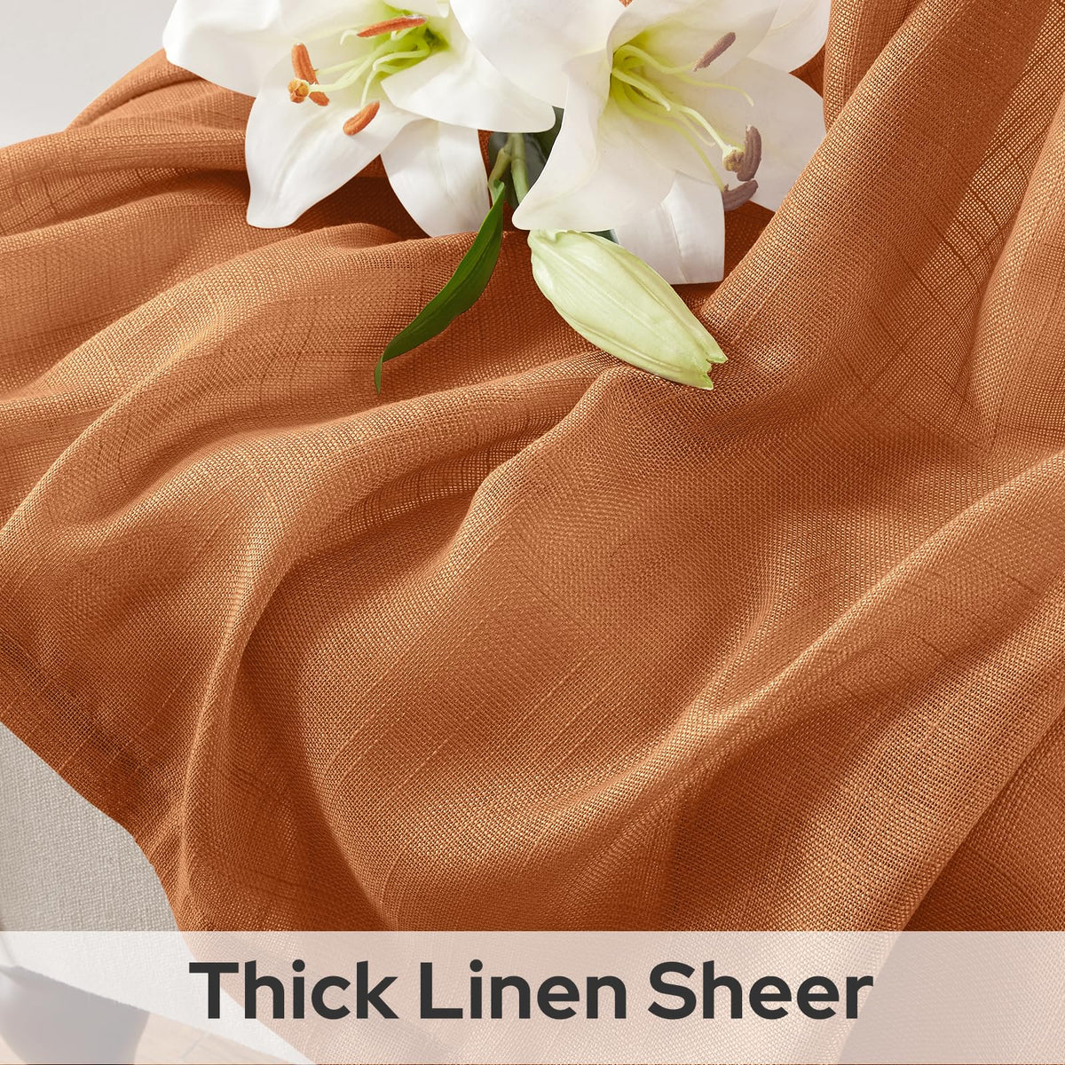 Q: What size are the HOMEIDEAS Burnt Orange Linen Sheer Curtains?A: The HOMEIDEAS Burnt Orange Linen Sheer Curtains are sold in a pack of 2 panels, each measuring 52 inches wide by 63 inches long.