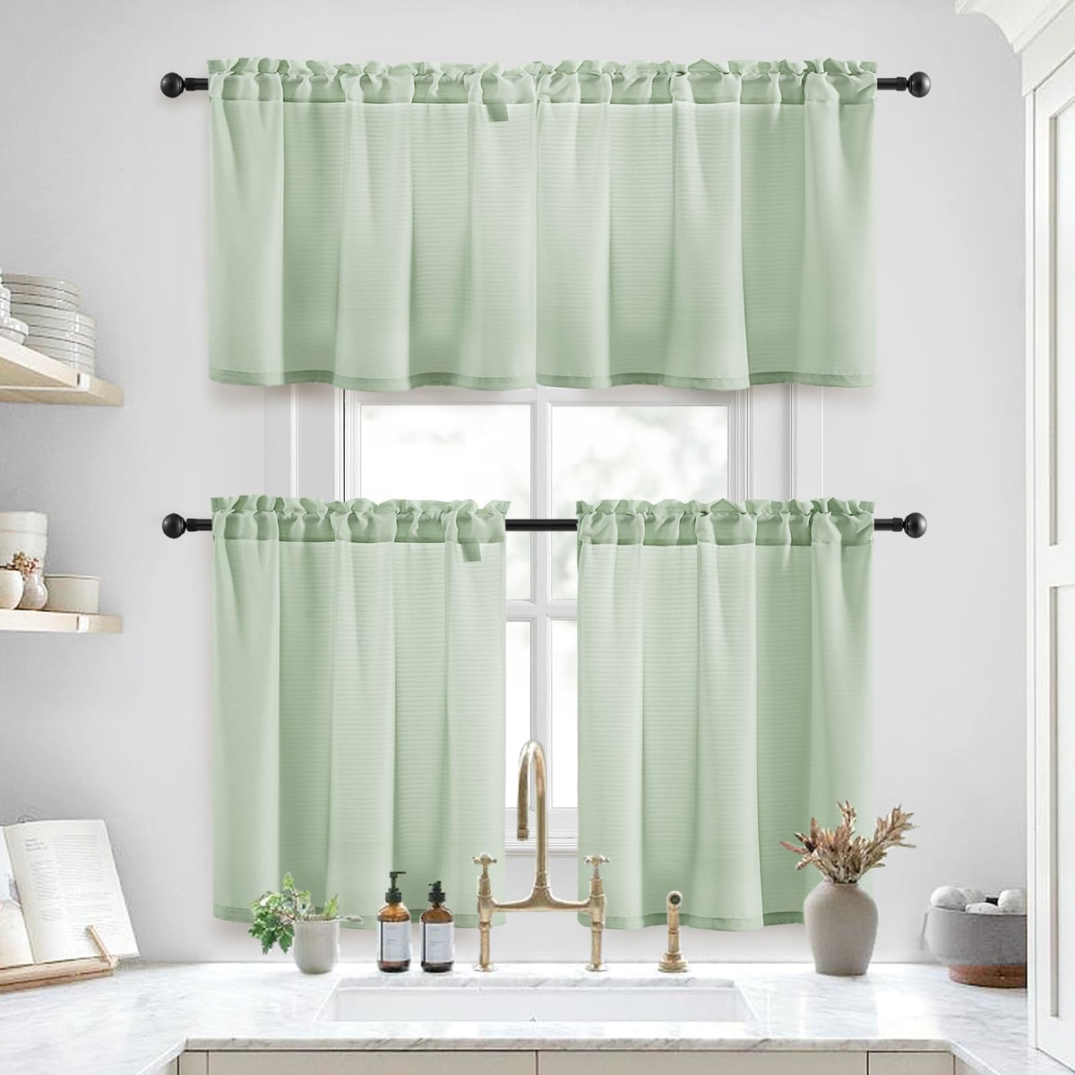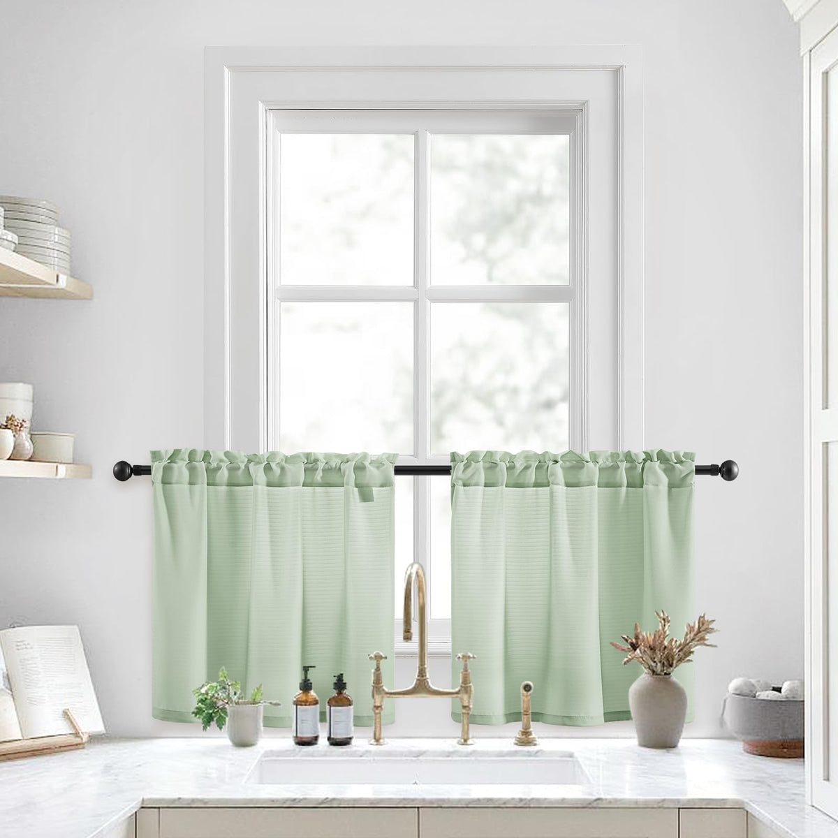 Q: What are the dimensions of the HOMEIDEAS Sage Green Kitchen Sheer Curtains?A: Each panel of the HOMEIDEAS Sage Green Kitchen Sheer Curtains measures 30 inches in width and 24 inches in length, and the package includes two panels.