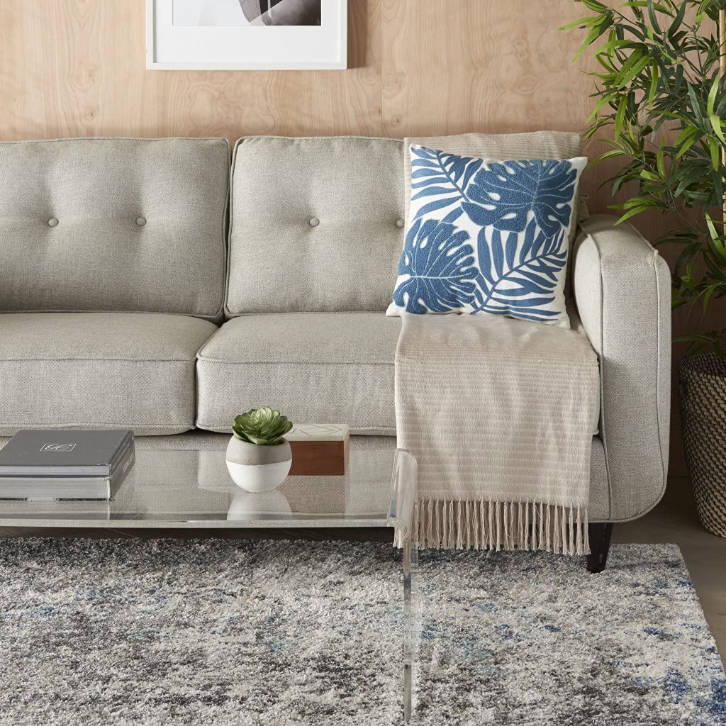 Make your home your permanent vacation spot by creating a tropical ambiance with the aid of this Blue and Ivory Tropical Leaves Throw Pillow. The whole body of the pillow is shrouded with wide wild leaves in a stoic matte blue, resting on an ivory backdrop making the leaves feel like they are resting in nature. This whole piece is made to last with the use of 100% cotton material which retains immaculate detail throughout its lifetime. Bring the comfort and relaxation of the tropics into your home in the most welcoming way. 18 x 18 x 5 Features. Constructed with super soft 100% cotton. Coastal, tropical, beach vibes. Palm leaves design. Super soft and durable. Playful texture on the front and flat solid on the back. Square shapeSpecifications. Material Cotton. Color Blue. Style Beach. Cover Material 100% Cotton. Fill Material Polyester. Insert Included Yes. Pattern Floral. Pillow Type Throw. Removable Cover Yes. Reverse Side Pattern different from front. Shape Square. Washing Method Spot clean. Height 5 in.. Width 18 in.. Depth 18 in.. Weight 2 lbs