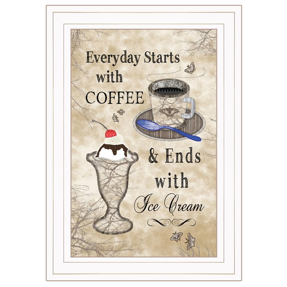 The everyday starts with coffee white framed print wall art is the perfect decorative accessory for your home. This print is a visual artistic expression that allows you to decorate your space in style. Reproduced for you on paper, this hanging decorative accent will be a trendy and fashionable way to dress your walls. Hang on your wall to add some up to date fashion and decoration. Instantly liven up your space with this art that brings color and dimension to your walls. Features. Coffee themed wall art. Great gift idea for the coffee lover. Great coffee related decor for kitchen, dining room, or cafe. Print has fade resistant surface texture no glass is necessary. Arrives ready to hang in a vertical orientation. Built to last, sturdy construction from wood print on paperSpecifications. EPP Compliant No. ITTO Compliant No. Art Type Print. Primary Art Material Paper. Number of Items Included 1. Orientation Vertical. Shape Rectangle. Bulb Included No. Subject Inspirational Quotes Sayings. Animals Not an Animal. Other Animals No. Plants Flowers Not Flowers. Other Plants Flowers No. Transportation Type Not Transportation. Sports Sports Teams Not Sports Sports Teams. Nature Scenes Not Nature Scenes. Other Nature Scenes No. Food Beverage Not Food Beverage. Other Food Beverage No. Other Entertainment No. U.S. States and Territories Not U.S. States and Territories. Cities Not Cities. Other Cities No. Other Countries No. Inspirational Quotes Sayings Encouragement. Maps Not Maps. Architecture Not Architecture. Frame Color White. Covering/Protection Yes. Season No Season. Holiday or Occasion No Holiday. Art Technique Print. Art Production Method Giclee. HandPainted Art No. Batteries Needed No. Production Run Open Edition. Frame Type Framed. Art Title Everyday Starts with Coffee 3. Framed Yes. Frame Material MDF. Room Kitchen. Material Wood Print On Paper. Color Yellow Green Gray Black Red Blue White. Style MidCentury Modern. Country of Origin United States America. D