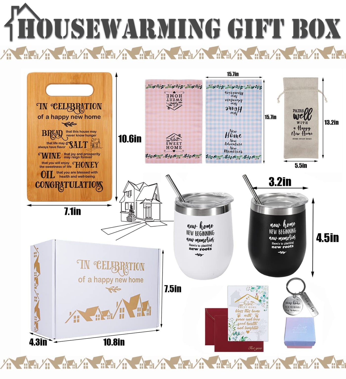 Q: What items are included in the House Warming Gifts New Home basket?A: The House Warming Gifts New Home basket includes a variety of practical items such as bamboo boards, 2 tumblers, wine bags, keychains, towels, and greeting cards, all beautifully designed and ready to gift.