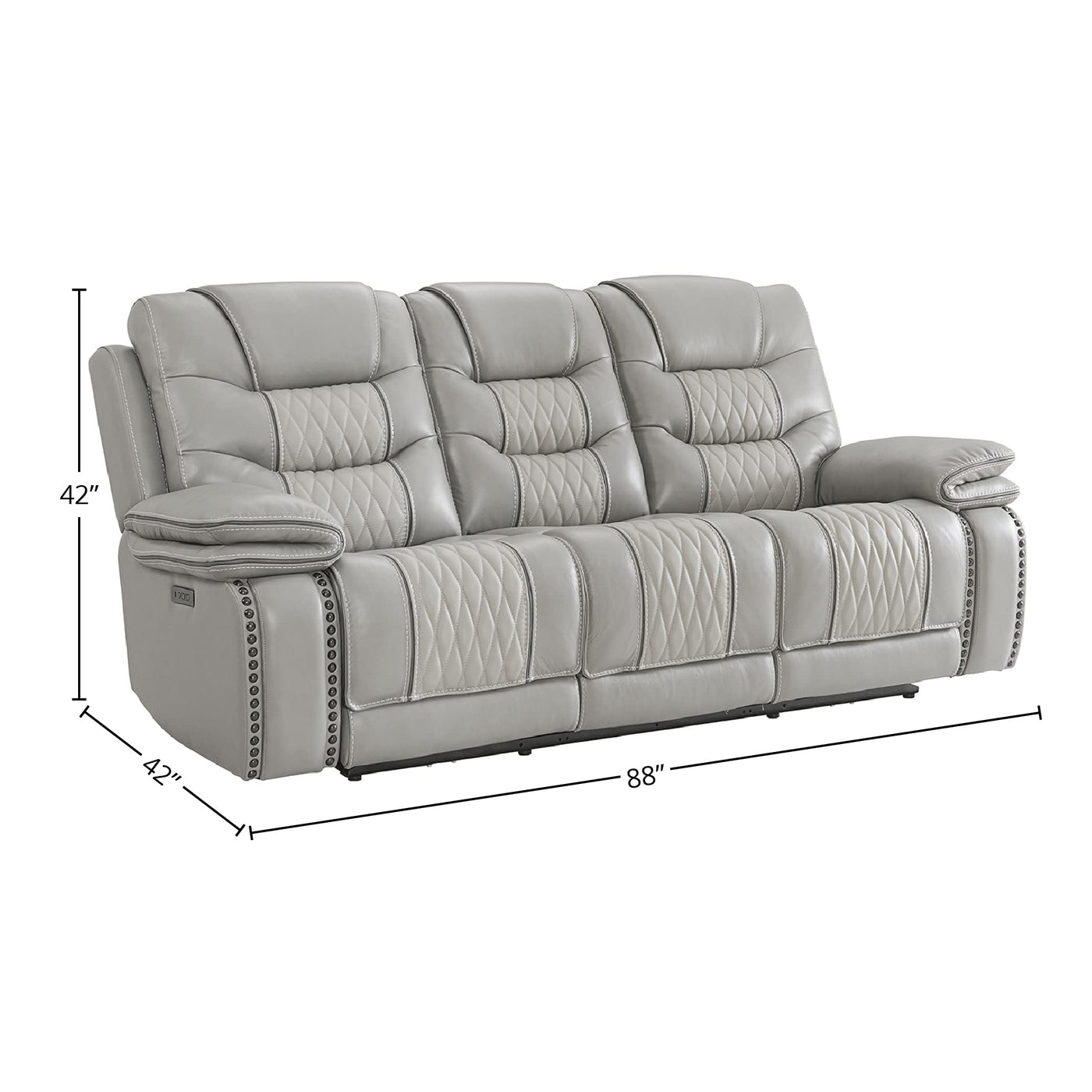 This beautiful sofa will be a hit in any home. The power headrest and power recliner seem hidden but add to the comfort of this stylish reclining group. The padded envelope arms add a visual appeal. The quilted back and bucket chaise seating add to the visual appeal without impacting the outstanding comfort of this piece. This set features a beautiful heavy-weight leather and accent nail trim that will only grow in its beauty and charm. Looking at this style from the front, you see genuine top-grain leather.FeaturesPine and engineered plywood frame construction is durable and made to last Dual-power recline and power headrest All switches include USB plug-ins Foam cushioned seats for maximum comfort Made from premium materials that are low-maintenance and easy to cleanDimensionsAssembled Product: 88 inches wide x 42 inches deep x 42 inches highIntercon was established in 1976 and has become an industry leader in designing, marketing and manufacturing wood dining, bedroom and home entertainment furniture. It has been a family owned and operated business for over forty years. Our design and warehouse capabilities allow us to be a leading provider of furniture throughout the United States and Canada. It is our mission to offer our customers superior quality products with lasting value.