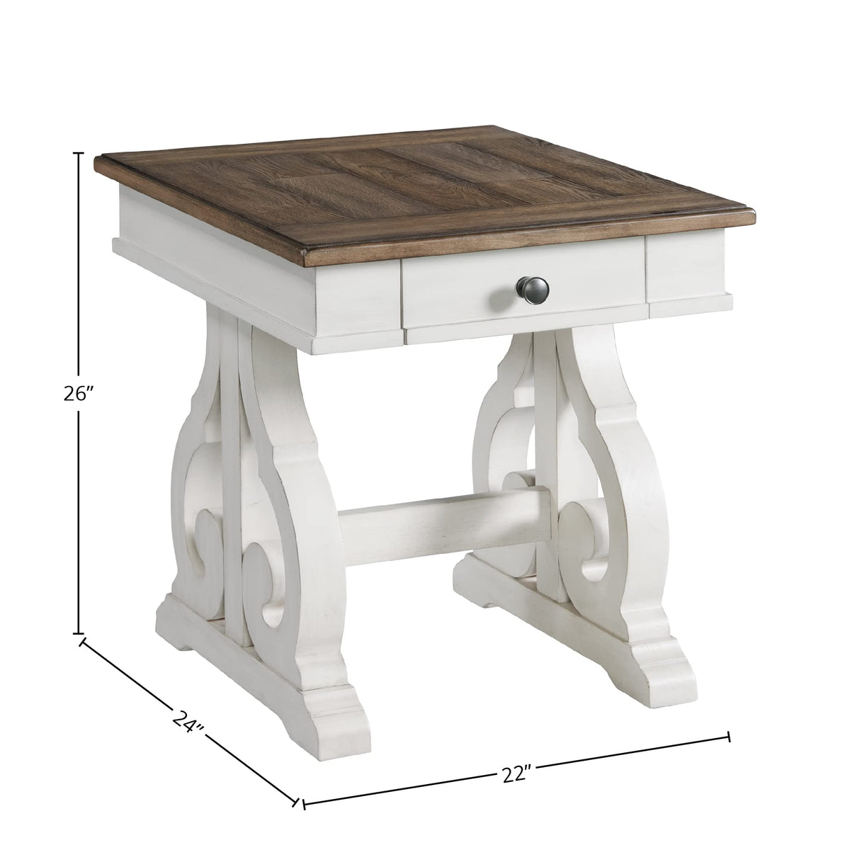 The Drake Living Room Collection End Table comes in a beautiful two-toned rustic white and French oak finish. It features a dainty drawer ideal for neatly tucking away small items and essentials. This unique collection also features an antique harp-style base constructed from rustic knotty oak veneer and select hardwood. Perfect for any living room, office, or family room, this end table is sure to wow.FeaturesTwo-toned rustic white and French oak finish suitable for all decor styles Rustic knotty oak veneer and select hardwood material is durable and made to last Unique harp base design is both functional and stylish Storage drawers for your convenience Easy to assemble and suitable for all furniture buildersDimensionsAssembled Product: 22 inches wide x 24 inches deep x 26 inches highIntercon was established in 1976 and has become an industry leader in designing, marketing and manufacturing wood dining, bedroom and home entertainment furniture. It has been a family owned and operated business for over forty years. Our design and warehouse capabilities allow us to be a leading provider of furniture throughout the United States and Canada. It is our mission to offer our customers superior quality products with lasting value.