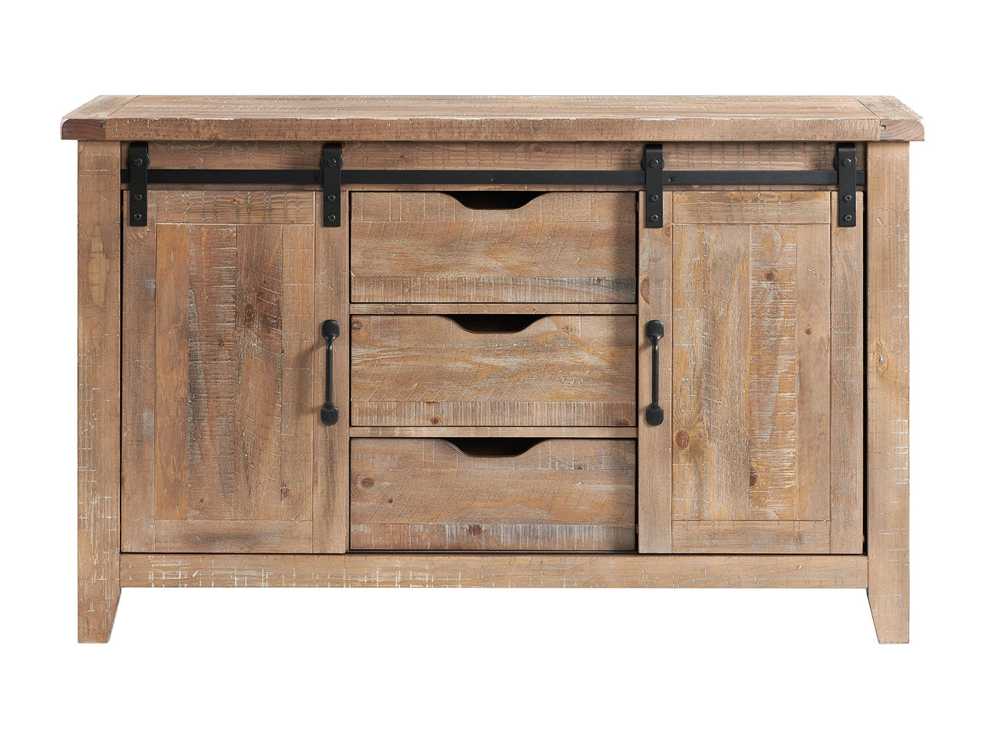 This Highland Sideboard is the perfect rustic addition to any home. This sideboard features beautiful metal gliding barn doors concealing ample storage space. This piece is also equipped with 3 spacious pull-out drawers to keep your area organized and clutter-free. This sideboard comes in a natural sandwash finish that's fade-resistant and made to last for generations.FeaturesRustic sandwash finish suitable for all decor styles Crafted from solid pine and pine veneer that's durable and made to last Adjustable shelves behind doors for your convenience Features 3 medium sized drawers for storage Ball bearing drawer glides provide easy opening and closingDimensionsAssembled Product: 60 inches wide x 18 inches deep x 36.75 inches high Drawer Width: 16 inches Drawer Depth: 14 inches Drawer Height: 6 inches Shelf Width: 24 inches Shelf Depth: 16 inches Shelf Height: 15 inches Weight Capacity: 300 poundsIntercon was established in 1976 and has become an industry leader in designing, marketing and manufacturing wood dining, bedroom and home entertainment furniture. It has been a family owned and operated business for over forty years. Our design and warehouse capabilities allow us to be a leading provider of furniture throughout the United States and Canada. It is our mission to offer our customers superior quality products with lasting value.