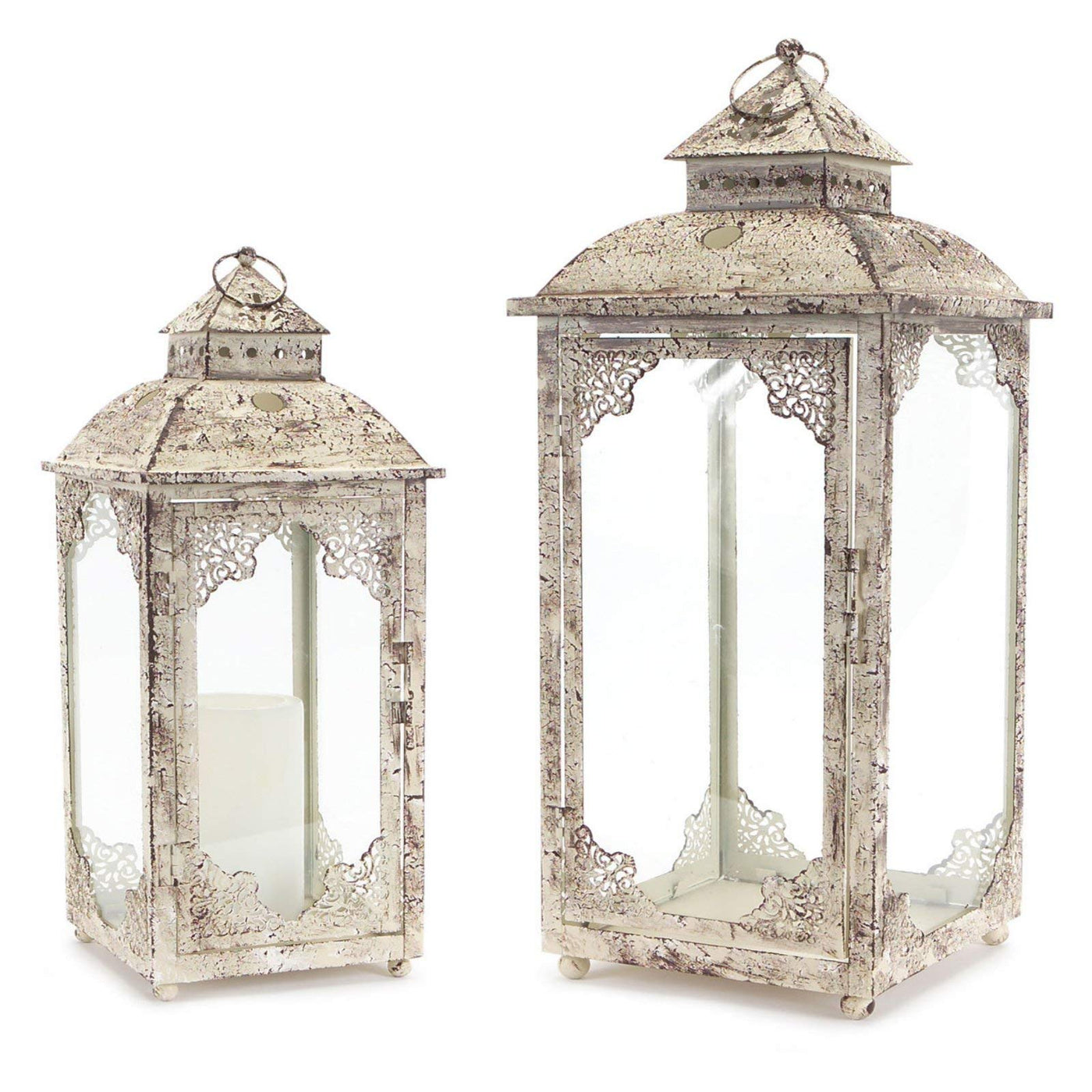 Lantern (Set of 2) 16.5''H, 22''H Iron/Glass Embellish your home with this vintage set of decorative lanterns. The ornate metal frame paired with a rustic weathered finish is the perfect combination to make a stunning piece. The sturdy metal composition is sure to last for seasons to come. Its a great addition to both every day and seasonal decor. Just add real wax or LED candles to complete the look. It also makes a great canvas for DIY faux floral arrangements. Measures 8.5 x 8.5 x 21.75 Primary Materials: Iron Metal, Glass Reccommended for indoor and outdoor covered use only Candles sold separately