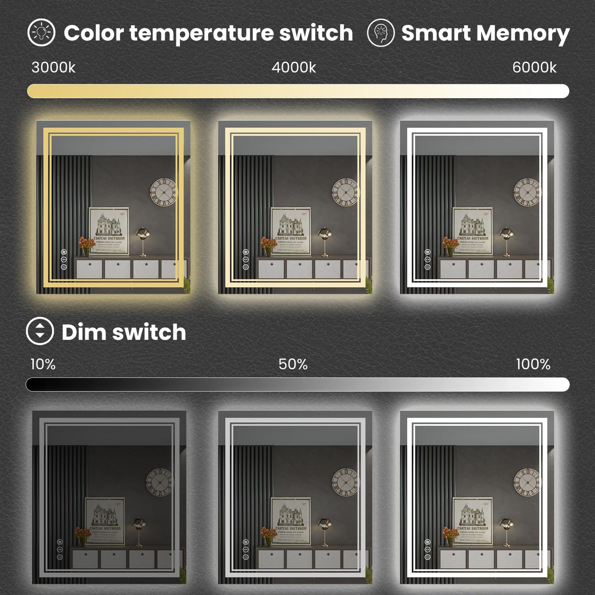 Q: Is the LED lighting adjustable on this bathroom mirror?A: Yes, the LED lighting on the ISTRIPMF mirror is adjustable. You can change the color temperature and dim the brightness using a single press of the ON/OFF button, with the settings remembered for future use.
