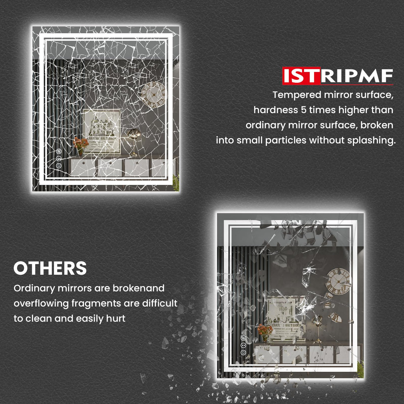 Q: What makes the ISTRIPMF mirror shatterproof and safe to use?A: The ISTRIPMF mirror is constructed with high-quality 5 MM tempered glass, which is both durable and resistant to breakage. This shatterproof and explosion-proof design enhances safety, making it ideal for bathroom use.