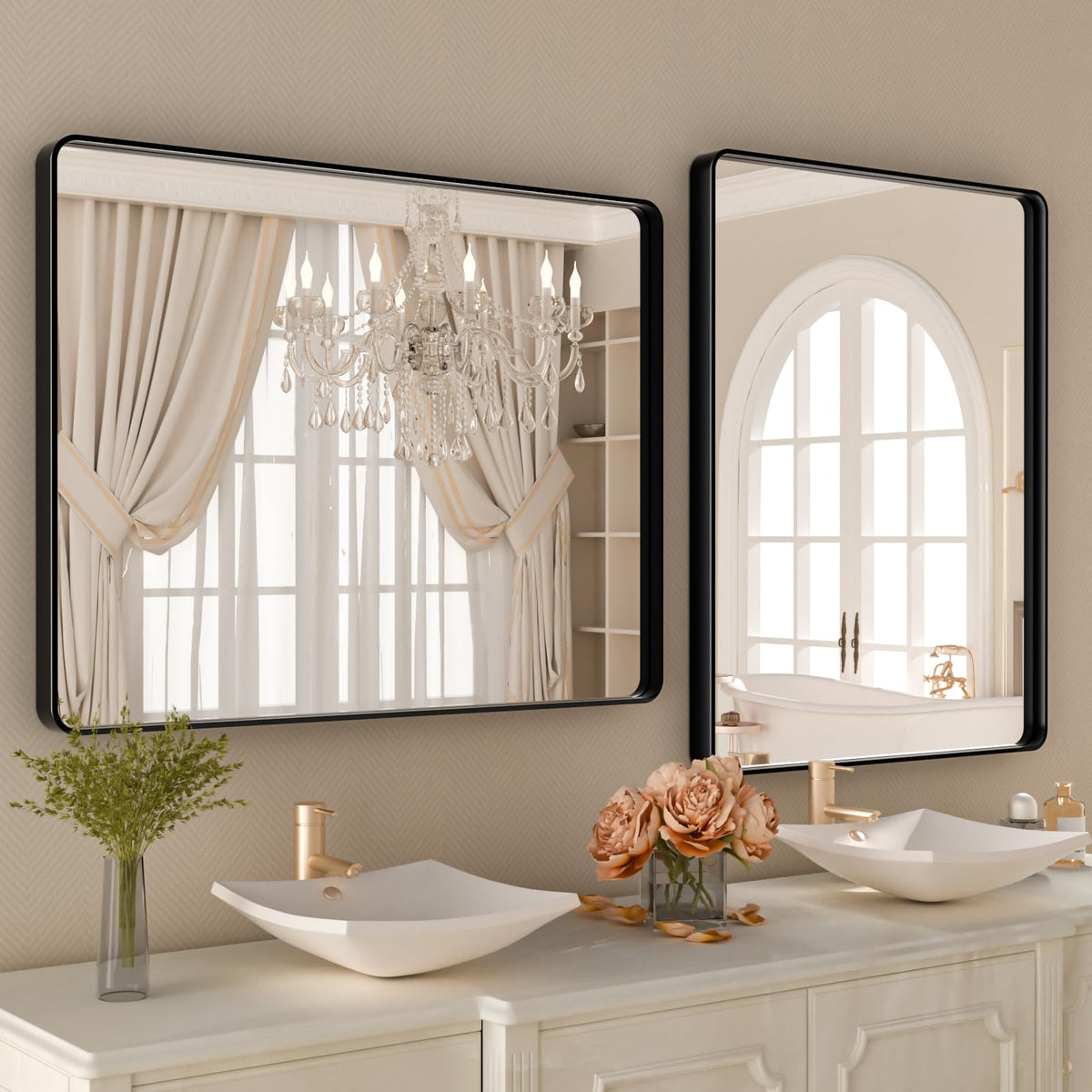 Istripmf 40X36 Inch Black Bthroom Mirror,Black Metal Frame Vanity Mirror For Wall,Rounded Corner Rectangle Matte Black Mirror,Te