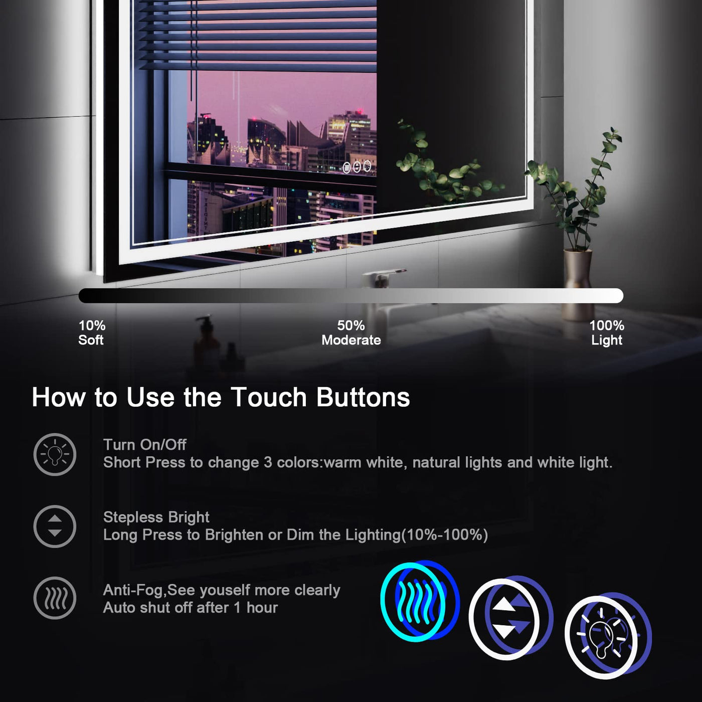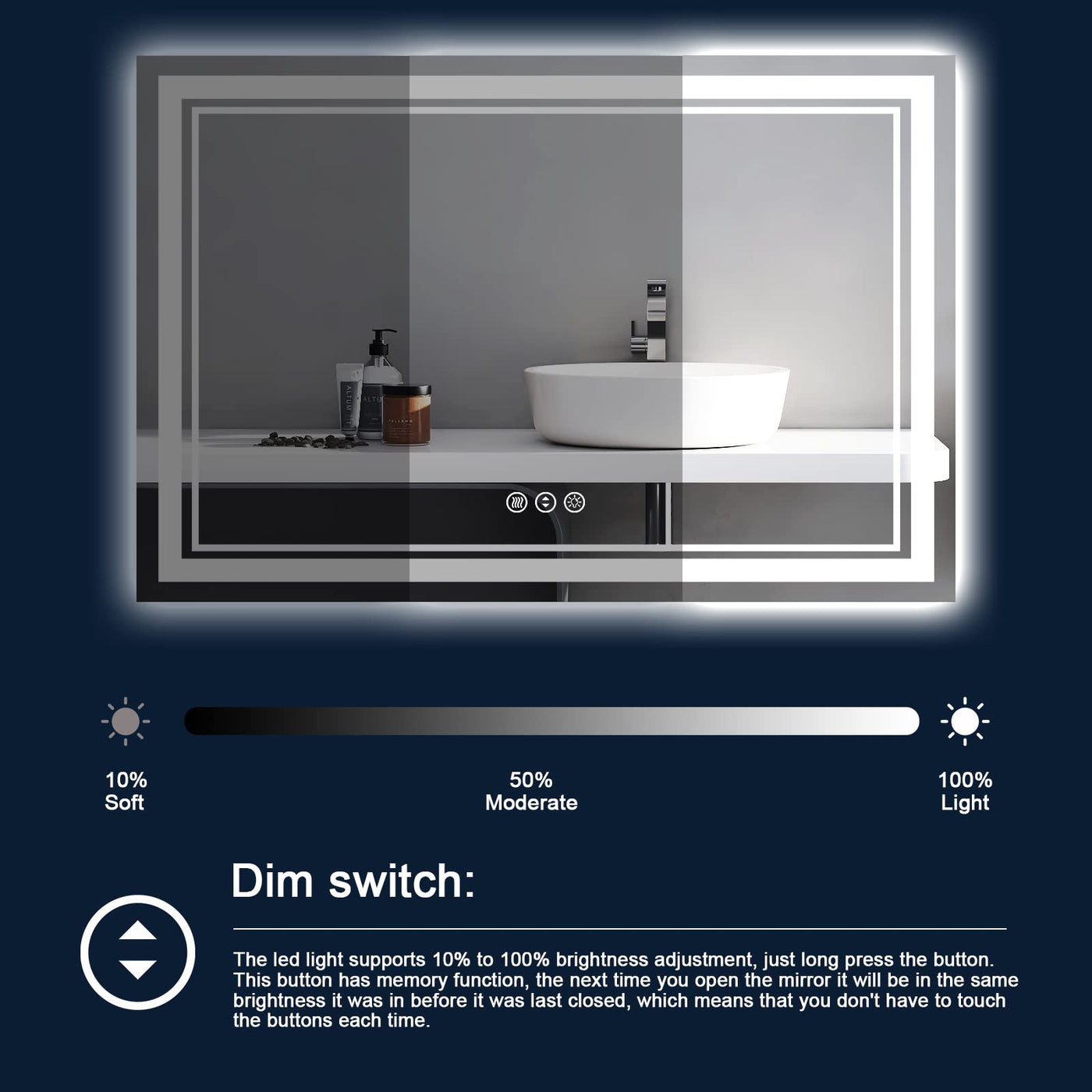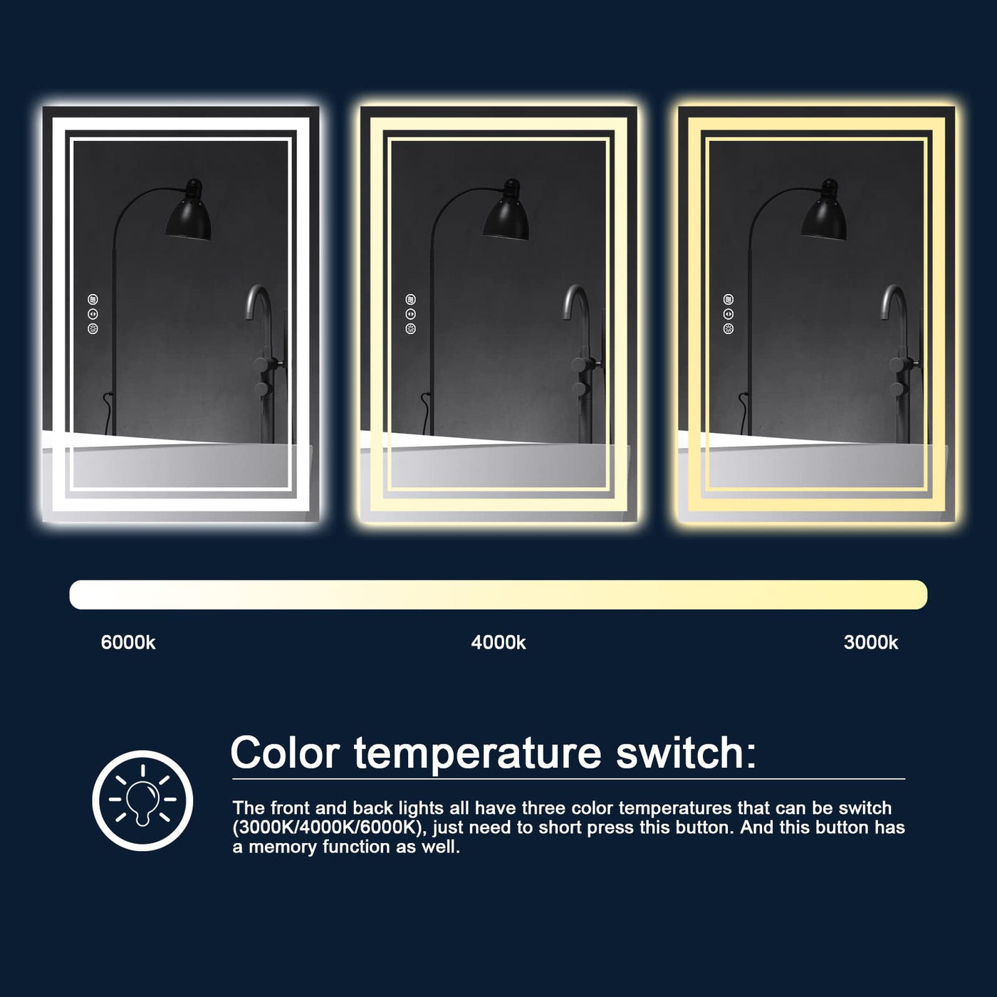 Q: How does the dimmable feature work on this mirror?A: The dimmable feature allows you to adjust the brightness of both the backlit and front light by simply pressing the ON/OFF button. Additionally, it offers three color temperature options, making it customizable to your preference.