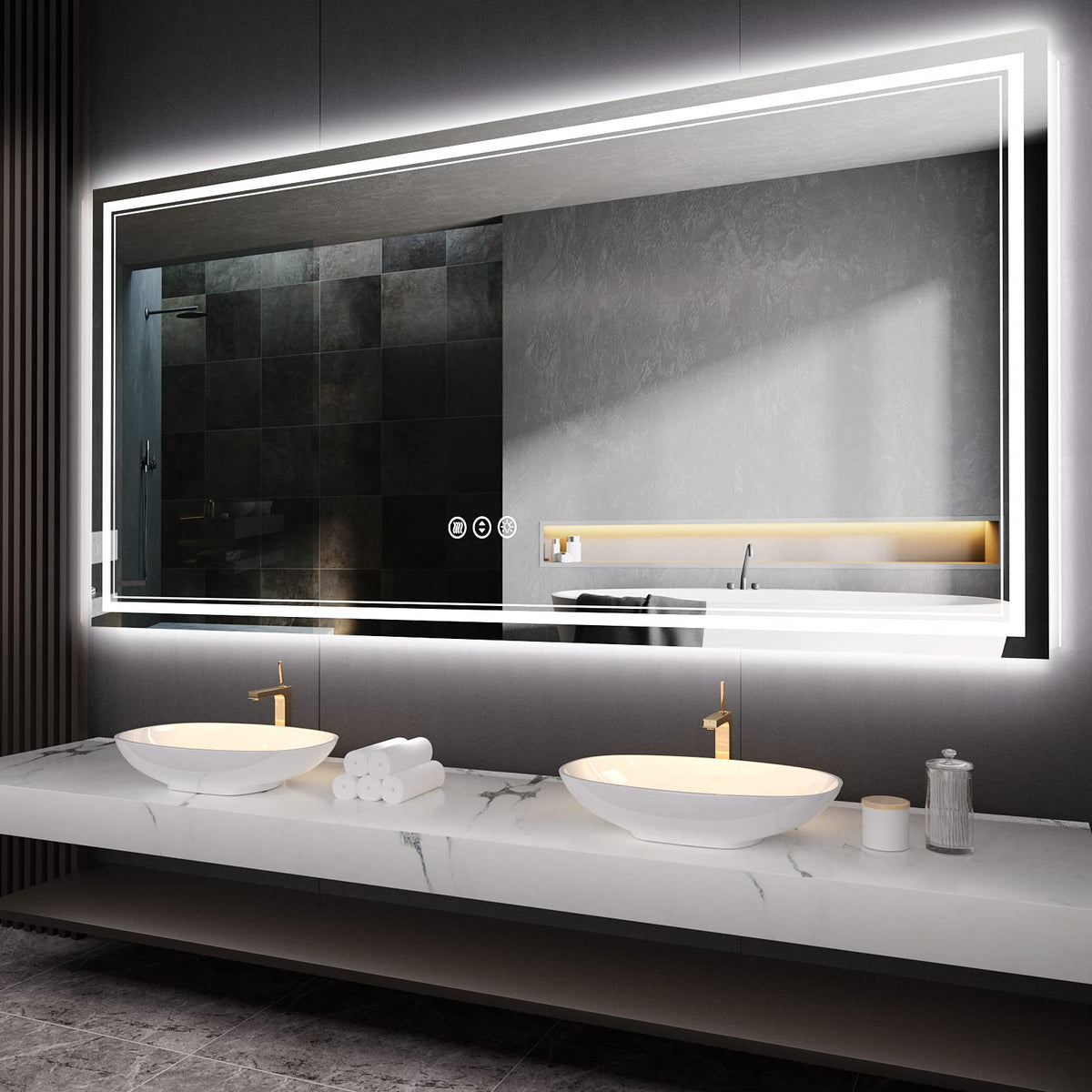 Q: How does the dimmable feature work on this mirror?A: The dimmable feature allows you to adjust the brightness of both the front and back lighting by pressing the ON/OFF button. Additionally, it has a memory function that remembers your last brightness setting for future use.
