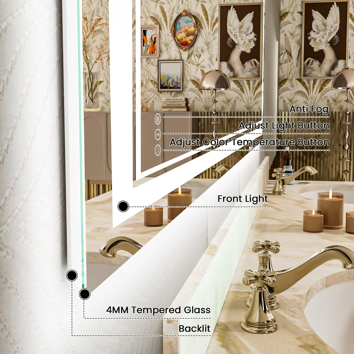 Q: How does the anti-fog feature work on this bathroom mirror?A: The anti-fog technology ensures that the mirror remains clear and free from condensation, even in a steamy bathroom environment. This feature allows for a clear reflection during and after a shower.